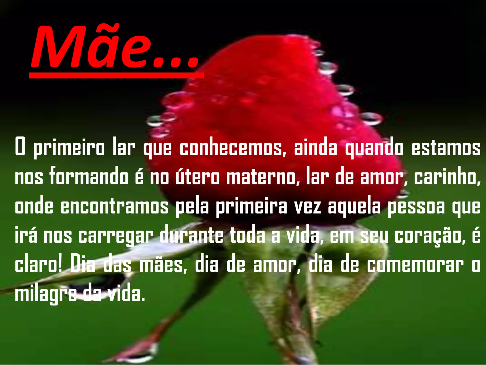 O documento celebra o amor incondicional das mães e como elas são o primeiro lar e apoio para os filhos. Ele descreve como as mães sempre estão presentes para cuidar, confortar e apoiar os filhos, mesmo quando eles erram, e como o amor de uma mãe é fundamental e permite que façam o impossível.