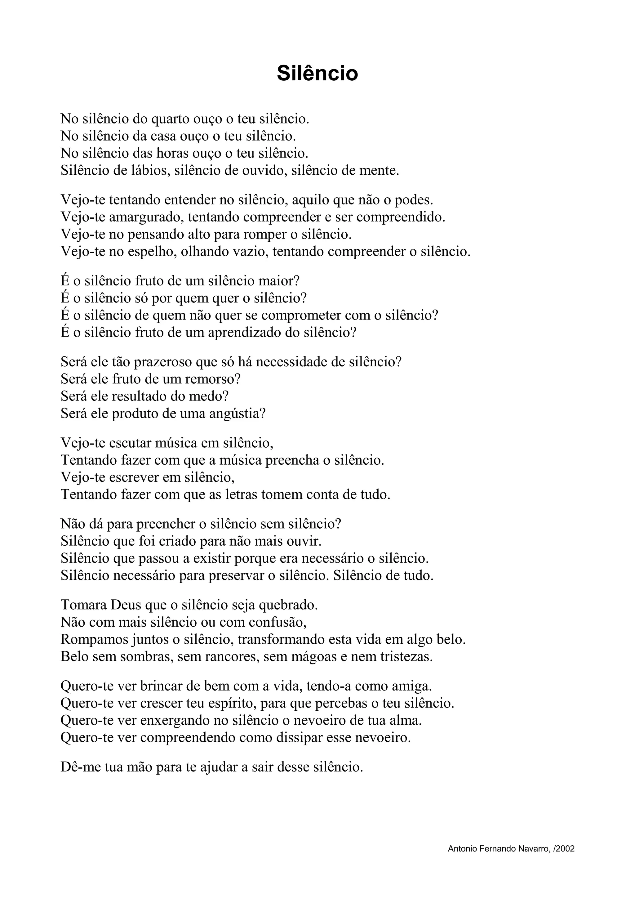 O poema descreve o silêncio profundo que alguém está sentindo. A pessoa está tentando entender o significado desse silêncio através da música e da escrita, mas nada parece preencher esse vazio. O poeta deseja quebrar esse silêncio juntos, transformando suas vidas em algo belo, sem mágoas ou tristezas, e ajudar a pessoa a compreender e dissipar a névoa em sua alma.