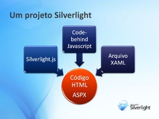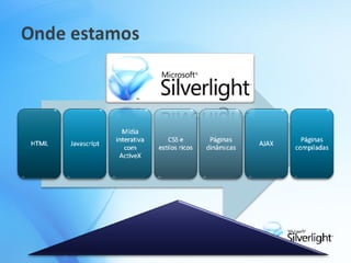 Silverlight é uma nova tecnologia da Microsoft para criação de aplicações web ricas que utiliza XAML para marcação e permite integração com ASP.NET, AJAX e JavaScript. Ele roda em múltiplos navegadores e sistemas operacionais, incluindo dispositivos móveis, e oferece recursos avançados como animações, streaming de mídia e interfaces ricas.