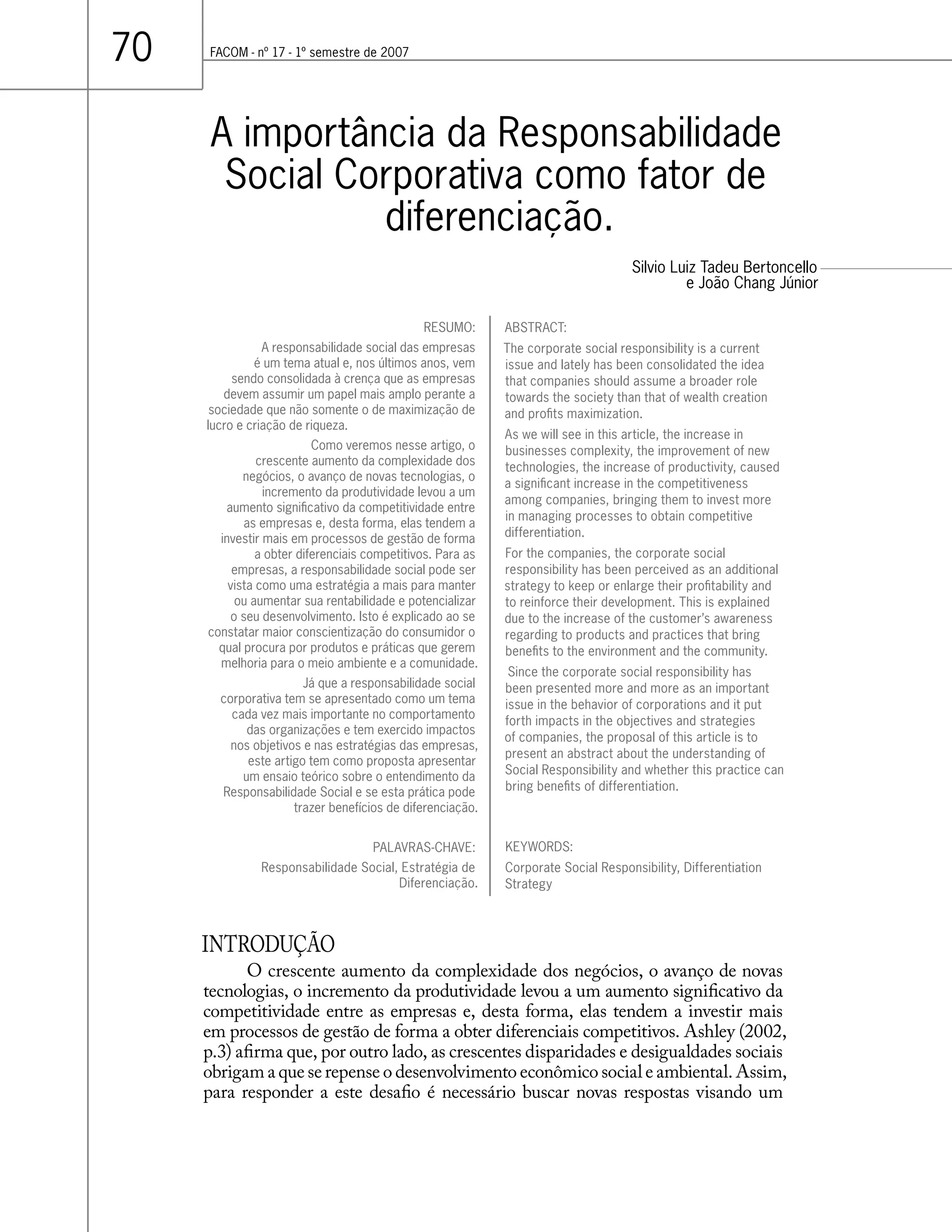 O documento discute a importância da responsabilidade social corporativa como fator de diferenciação competitiva para as empresas. Ele explica que a crescente competitividade levou as empresas a buscarem estratégias de gestão para se diferenciarem, e a responsabilidade social pode ser uma delas, já que os consumidores valorizam cada vez mais práticas sustentáveis. O documento também apresenta um histórico do conceito de responsabilidade social e diferentes abordagens do tema.