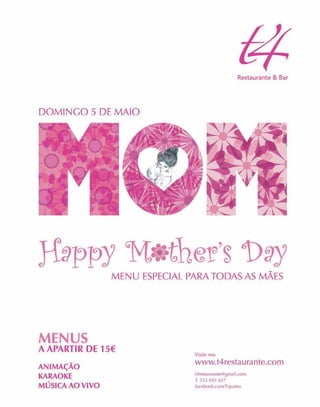 Este documento deseja a todas as mães um Feliz Dia da Mãe no domingo, 5 de maio de 2013. Ele também fornece informações de contato para três empresas de artes gráficas: publito, liminho e tilgráfica.