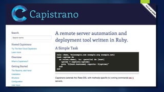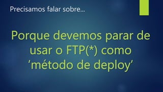 O documento discute as desvantagens de publicar arquivos manualmente em produção e propõe a adoção de estratégias de deploy automatizado como Continuous Integration e Continuous Delivery. O autor apresenta ferramentas como Git, Capistrano e outros para automatizar o deploy e garantir que as alterações sejam publicadas de forma segura, controlada e revertida caso necessário. Ele também enfatiza a importância de testes automatizados e ambientes de homologação para evitar problemas.