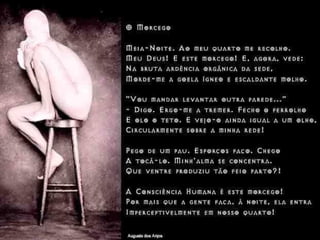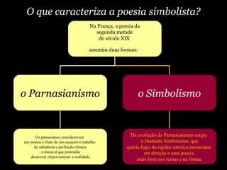 O documento descreve o Simbolismo como um movimento literário que surgiu na França no século XIX, caracterizado pela sugestão, criação de imagens fluidas e apresentação subjetiva da realidade. Aponta Baudelaire, Mallarmé, Verlaine e Rimbaud como ícones do Simbolismo, e destaca Cruz e Souza, Alphonsus de Guimaraens e Augusto dos Anjos como expoentes do Simbolismo no Brasil.