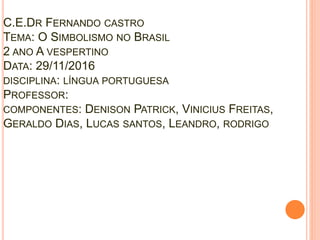 O documento discute o Simbolismo no Brasil, descrevendo sua origem na década de 1890 e características como o uso de símbolos, temas subjetivos e hermetismo. Destaca Cruz e Sousa e Alphonsus de Guimaraens como principais autores simbolistas brasileiros do período.