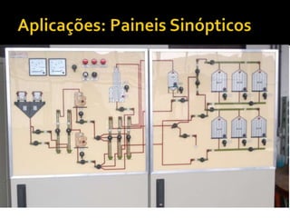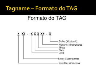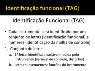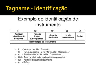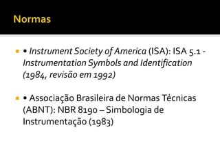 O documento discute as normas e simbologias de instrumentação, os tipos de diagramas utilizados e os componentes de um sistema de instrumentação, incluindo tags, instrumentos, equipamentos e suas funções. É definido também o sistema de identificação funcional dos instrumentos através de letras que indicam a variável medida e funções.