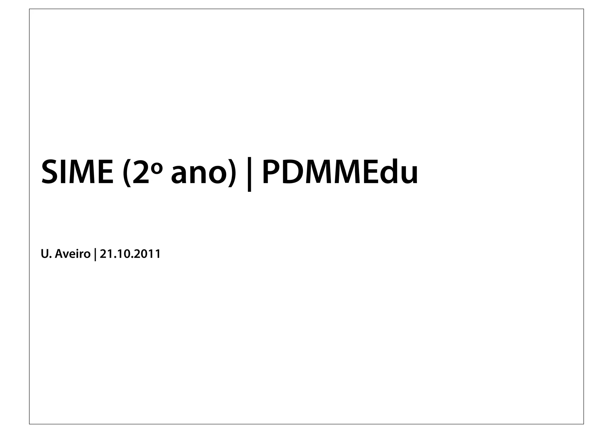 Este documento descreve o seminário de investigação em multimédia em educação (SIME) do 2o ano do programa de doutoramento. O seminário visa avaliar o progresso do projeto de investigação desenvolvido no 1o ano e inclui objetivos como desenvolver capacidades de investigação e apresentar propostas de resolução de problemas. A avaliação baseia-se no desenvolvimento teórico, trabalho de campo e publicações, e na dinamização ou participação num seminário sobre o projeto.