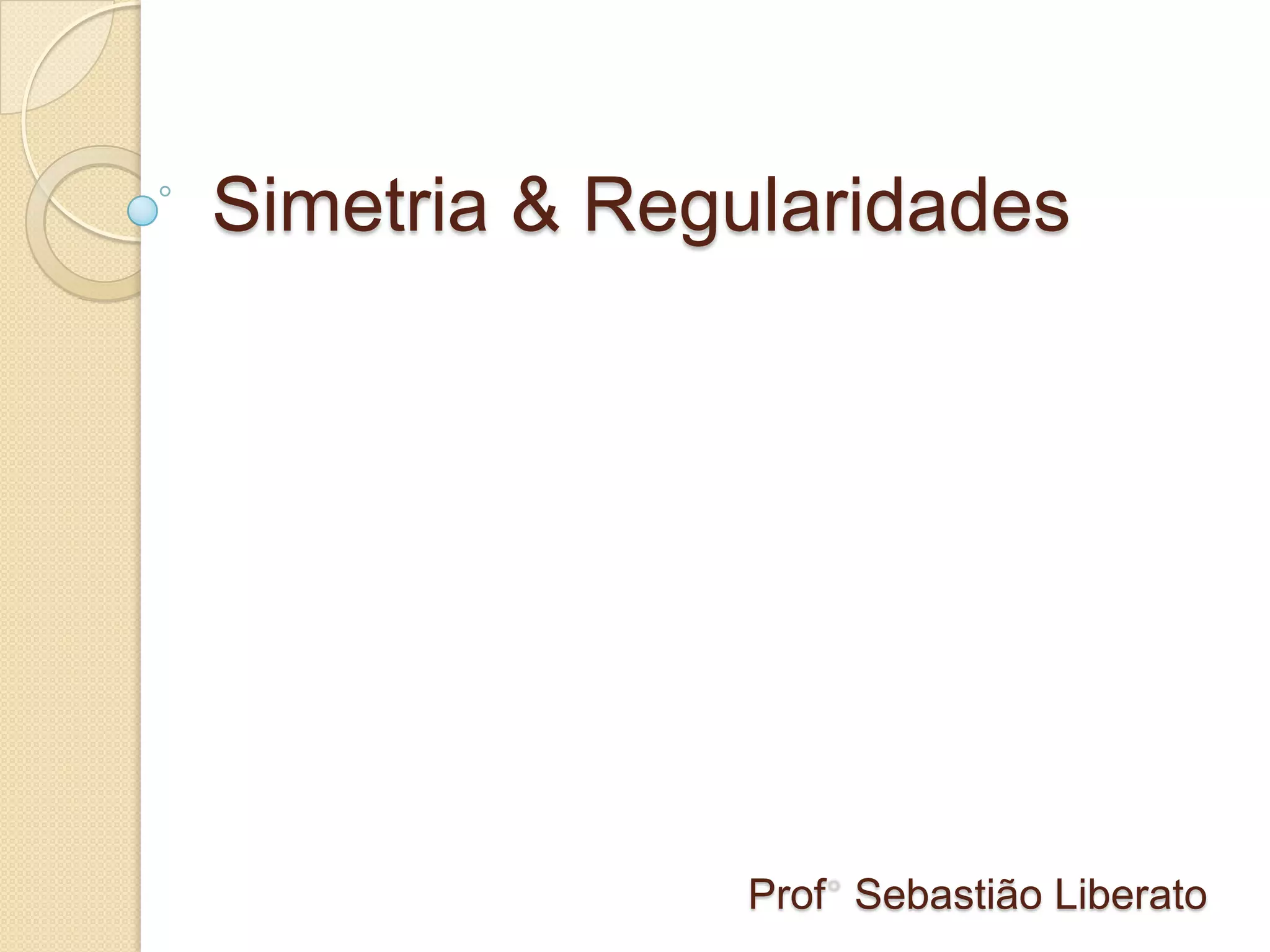 O documento discute os conceitos de simetria em matemática, incluindo tipos como simetria especular, de rotação e de translação. Explora conceitos fundamentais como plano de simetria, linha de simetria e centro de simetria. Também aborda aplicações da simetria na natureza, arquitetura, arte e fractais.