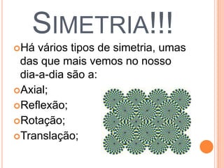 O documento explora diferentes tipos de simetria, incluindo simetria axial, reflexão, rotação e translação. A simetria axial apresenta eixos simétricos, enquanto a reflexão inverte figuras. A rotação depende de um ângulo sobre um eixo e a translação envolve sequências repetitivas.