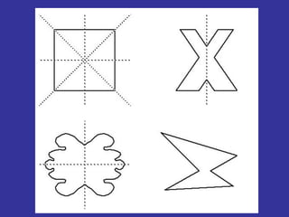O documento discute os conceitos de simetria na geometria, biologia e arte, incluindo exemplos de palíndromos em português. Também apresenta a obra do artista M.C. Escher, notável por usar conceitos matemáticos como reflexão, rotação e translação.