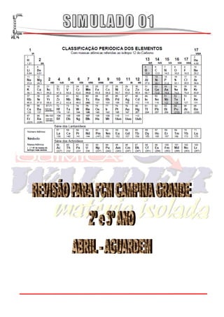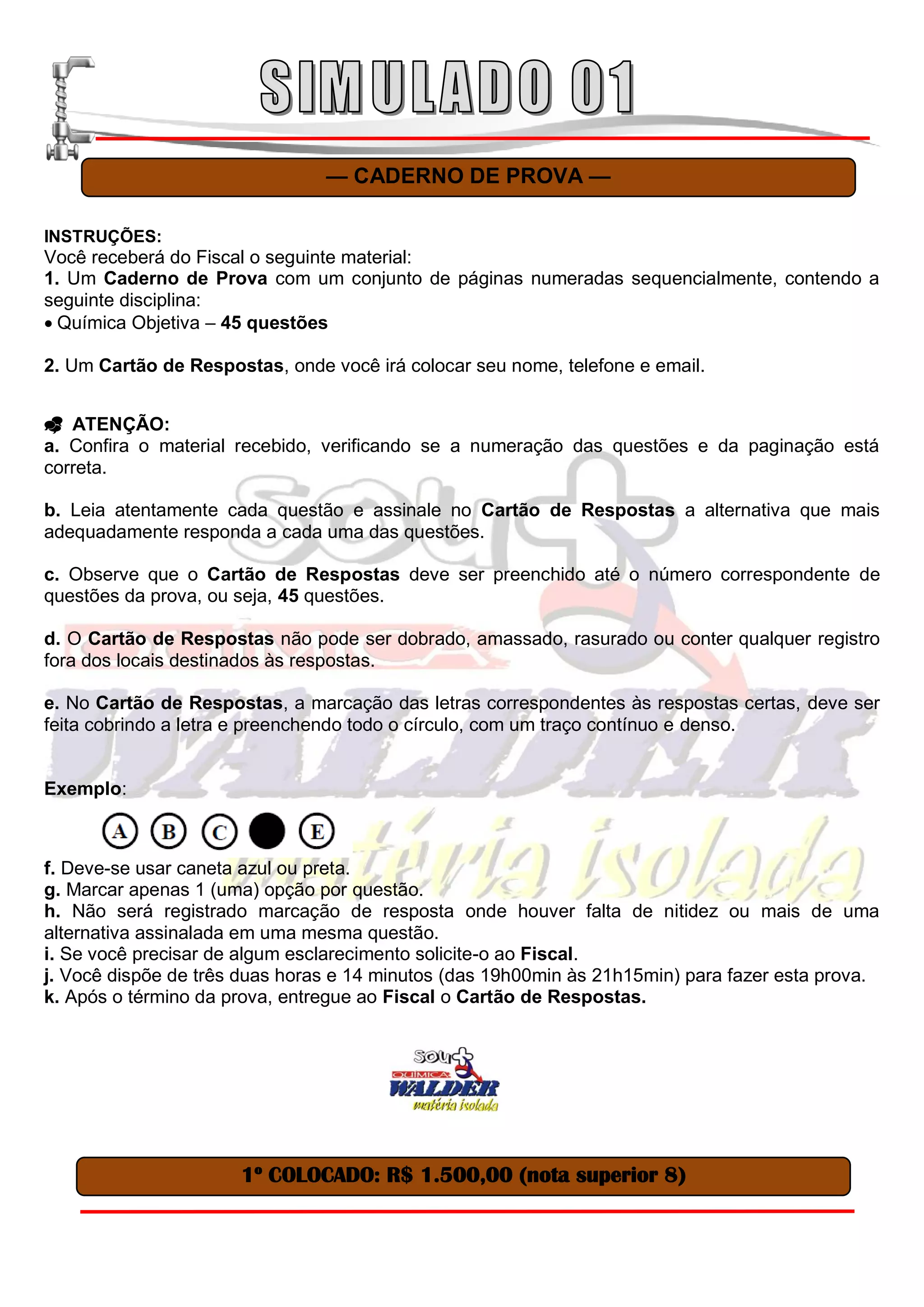 O documento fornece instruções sobre uma prova de Química Objetiva com 45 questões. Os alunos receberão um caderno de prova com as questões numeradas e um cartão de respostas para registrar as alternativas escolhidas. Eles terão 3 horas e 14 minutos para responder todas as questões.