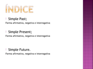 O documento descreve as formas afirmativa, negativa e interrogativa do Simple Past, Simple Present e Simple Future em inglês. Detalha como esses tempos verbais são conjugados de acordo com o sujeito, incluindo exceções na formação de alguns verbos no passado.