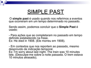 O documento explica a diferença entre o Simple Past e o Past Progressive em inglês. O Simple Past é usado para ações completadas no passado em um tempo definido, enquanto o Past Progressive descreve ações que estavam acontecendo ou em progresso no passado. O documento fornece exemplos e regras para a formação de frases nesses tempos verbais em inglês.