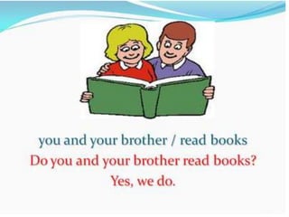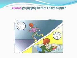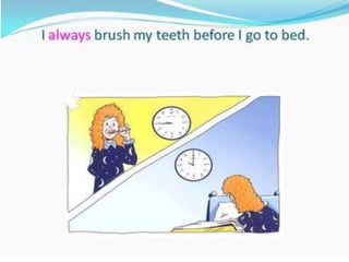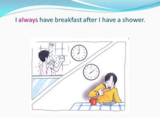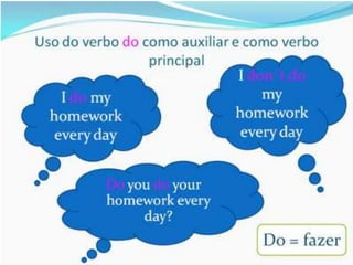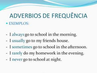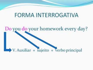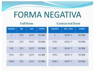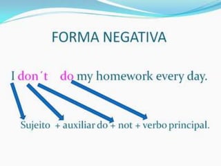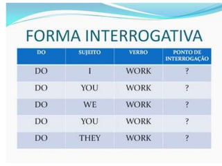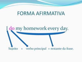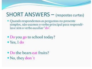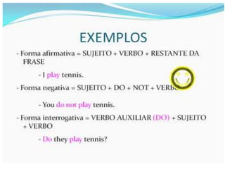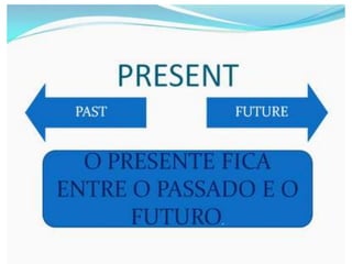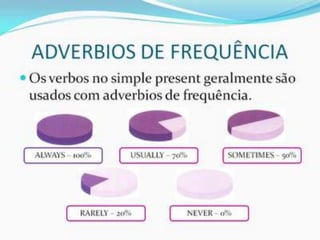 O documento fornece uma apresentação em PowerPoint sobre o tempo verbal Simple Present no inglês, abordando suas principais características e exemplos de uso.