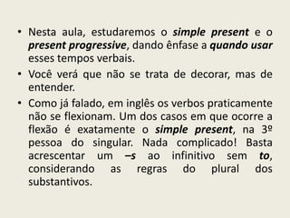 O documento discute o uso do Simple Present e do Present Progressive em inglês. Explica como formar cada tempo verbal de forma afirmativa, negativa e interrogativa e em que situações cada um é usado, como para expressar hábitos, verdades gerais e ações no momento.