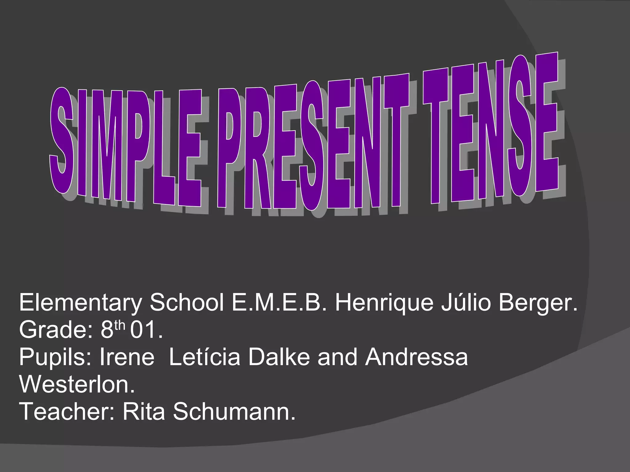 Simple Present TenseAfirmative form : O verbo vem depois do sujeito. Ex: I work at night. (Eu trabalho a noite). Quando se trata da 3º pessoa do singular (he, she, it) acrescenta-se “s” ao verbo que acompanha o sujeito.