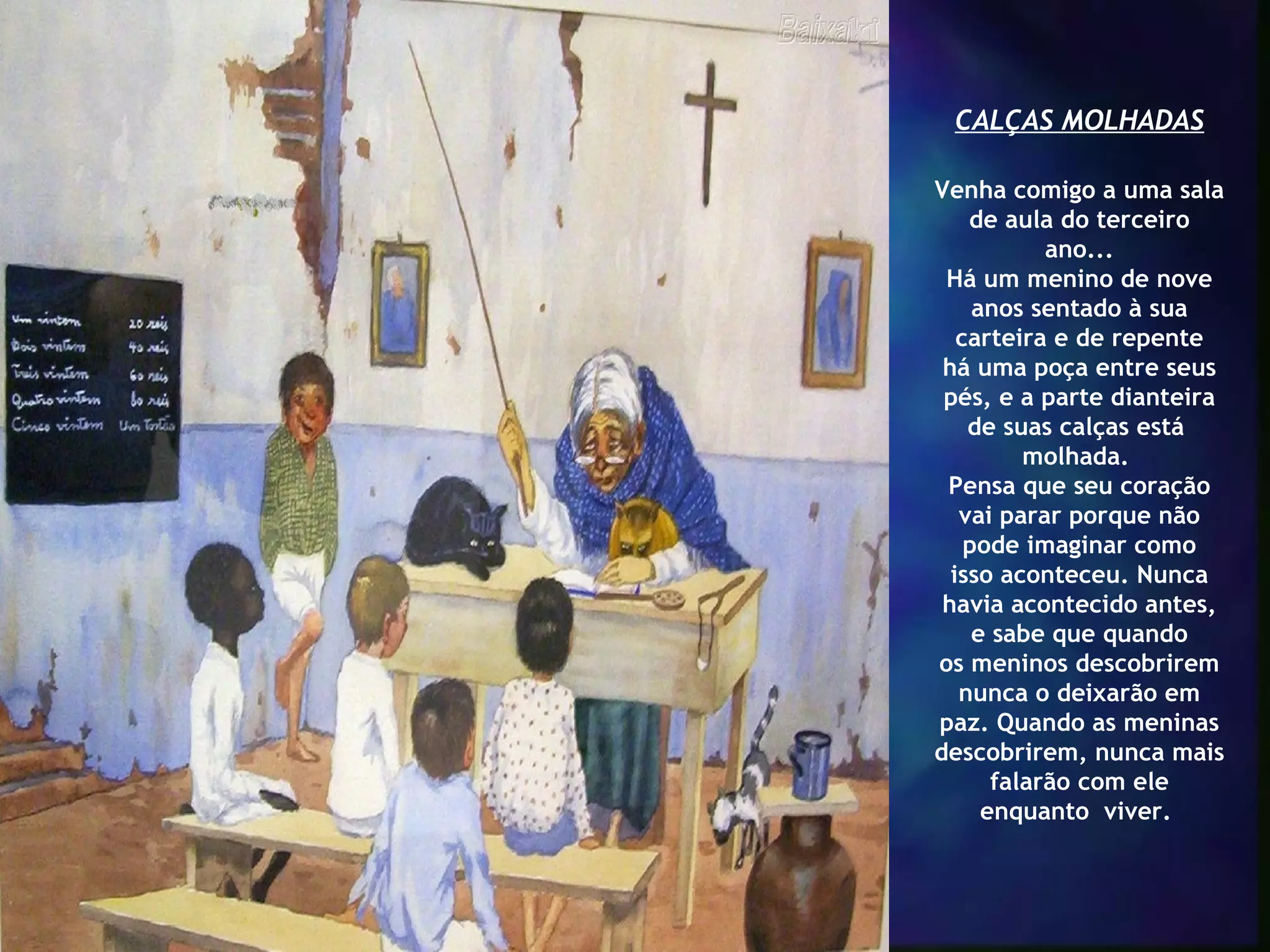 O documento conta a história de um menino de 9 anos que teve um acidente de urina na escola. Uma colega, Susie, finge derramar água nele para livrá-lo da vergonha. No final, o menino agradece a Susie por ter o ajudado, mostrando compaixão. O texto reflete sobre a importância de ajudar os outros em necessidade.