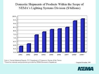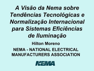 O documento discute tendências e normalização internacional para sistemas de iluminação eficientes. Apresenta fatores que motivam a mudança para sistemas mais sustentáveis e descreve programas e legislação dos EUA que incentivam a eficiência energética na iluminação, podendo reduzir o consumo em até 50%. Também aborda a importância da normalização para garantir a segurança e interoperabilidade dos produtos.