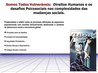O documento discute o uso de estratégias de comunicação baseadas em mangás para prevenir o avanço do HIV/AIDS entre brasileiros que vivem no Japão e na comunidade Nikkey no Brasil. O objetivo é elaborar material impresso, um projeto gráfico e personagens de mangá para promover a saúde e prevenção de DSTs.