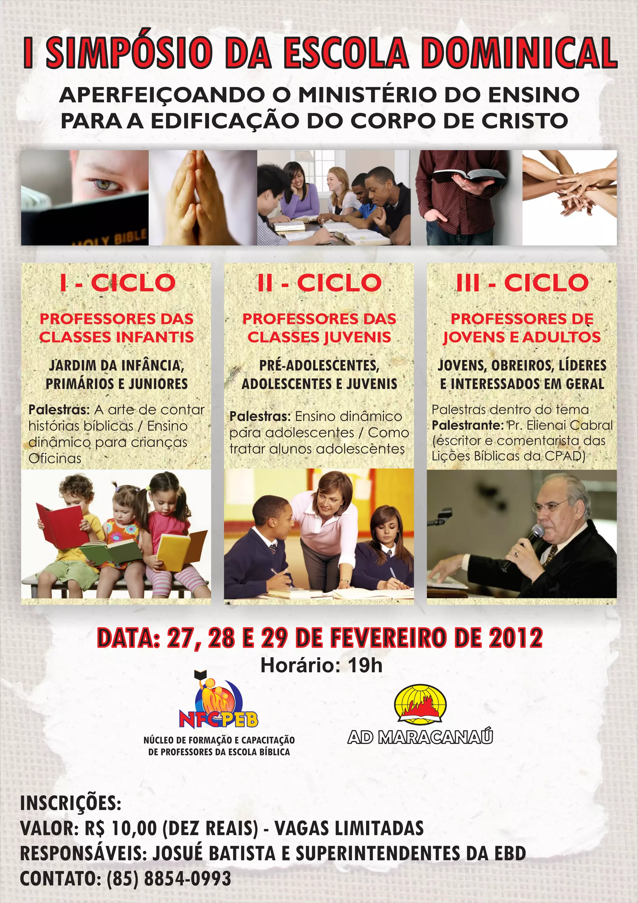 O documento trata de um evento de formação e capacitação para professores da escola bíblica, com palestras sobre ensino dinâmico e histórias bíblicas, ministradas pelo pr. Elienai Cabral. O evento ocorrerá entre 27 e 29 de fevereiro de 2012, às 19h, em Maracanaú, com inscrições custando R$ 10,00. As vagas são limitadas, e mais informações podem ser obtidas através do contato indicado.
