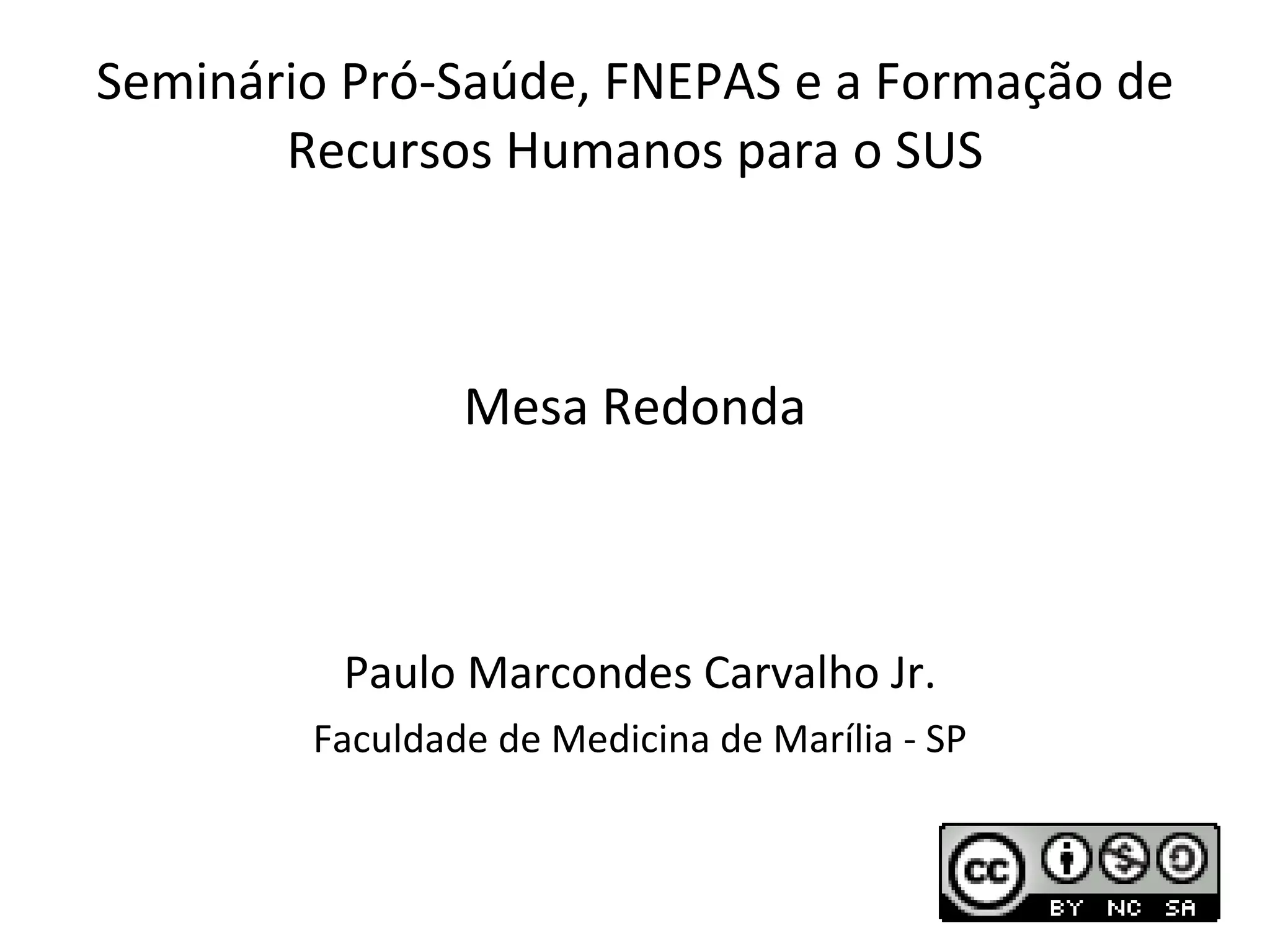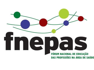 O documento discute a formação de recursos humanos para o SUS no Brasil. Apresenta os princípios e eixos de ação do Programa Pró-Saúde e do Fórum Nacional de Entidades Representativas da Área da Saúde (FNEPAS), incluindo a orientação teórica, cenários de prática e orientação pedagógica. Também discute conceitos de currículo, avaliação, e modos alternativos de aprendizagem ativa.