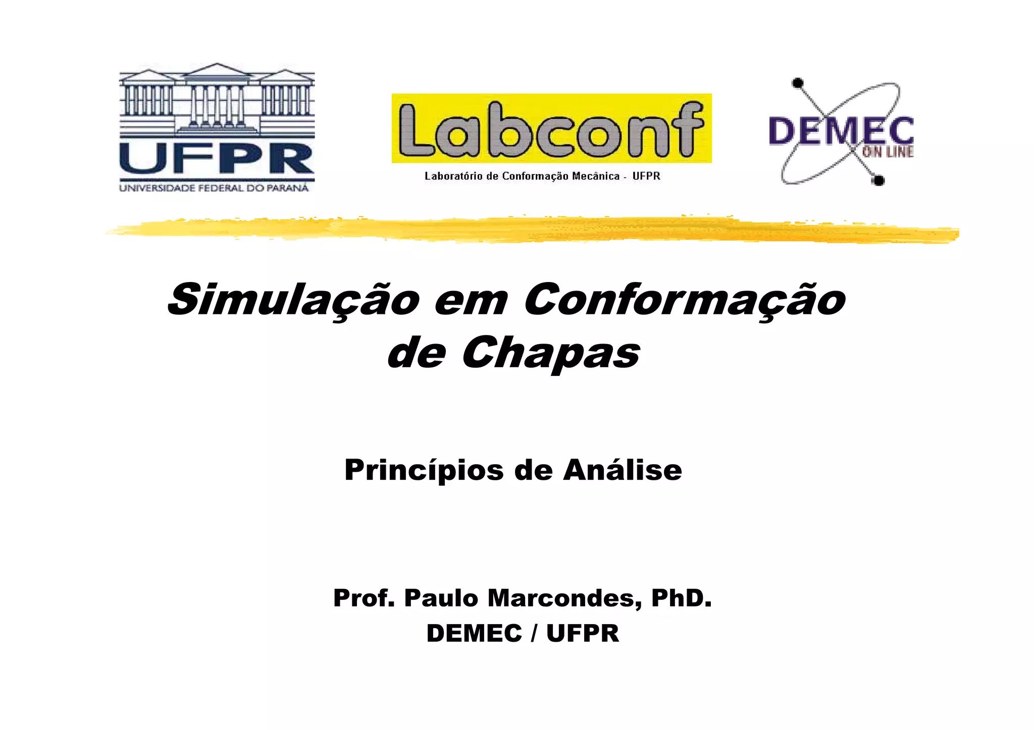 O documento discute princípios de análise estrutural por meio de simulação computacional utilizando o método dos elementos finitos. Aborda tópicos como análise linear e não-linear, origens da não-linearidade, critérios de escoamento e endurecimento, solução dinâmica não-linear por métodos implícitos e explícitos e fatores que influenciam a conformação de chapas.