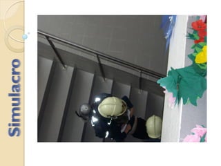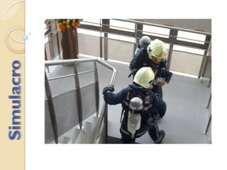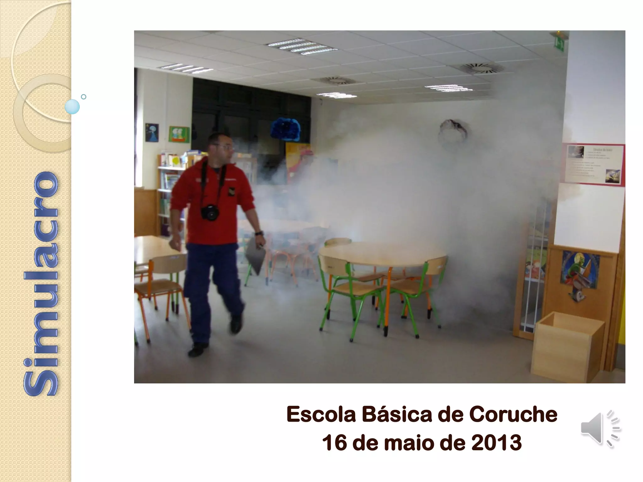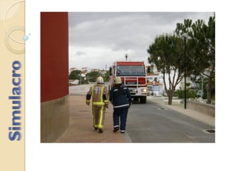 O documento descreve um simulacro de incêndio realizado na Biblioteca Escolar de Coruche em que dois alunos ficaram presos no interior com fumo aumentando. Os bombeiros municipais de Coruche chegaram e realizaram operações de resgate das vítimas, evacuação para ambulâncias e conclusão do simulacro com sucesso e dedicação de todos os envolvidos.