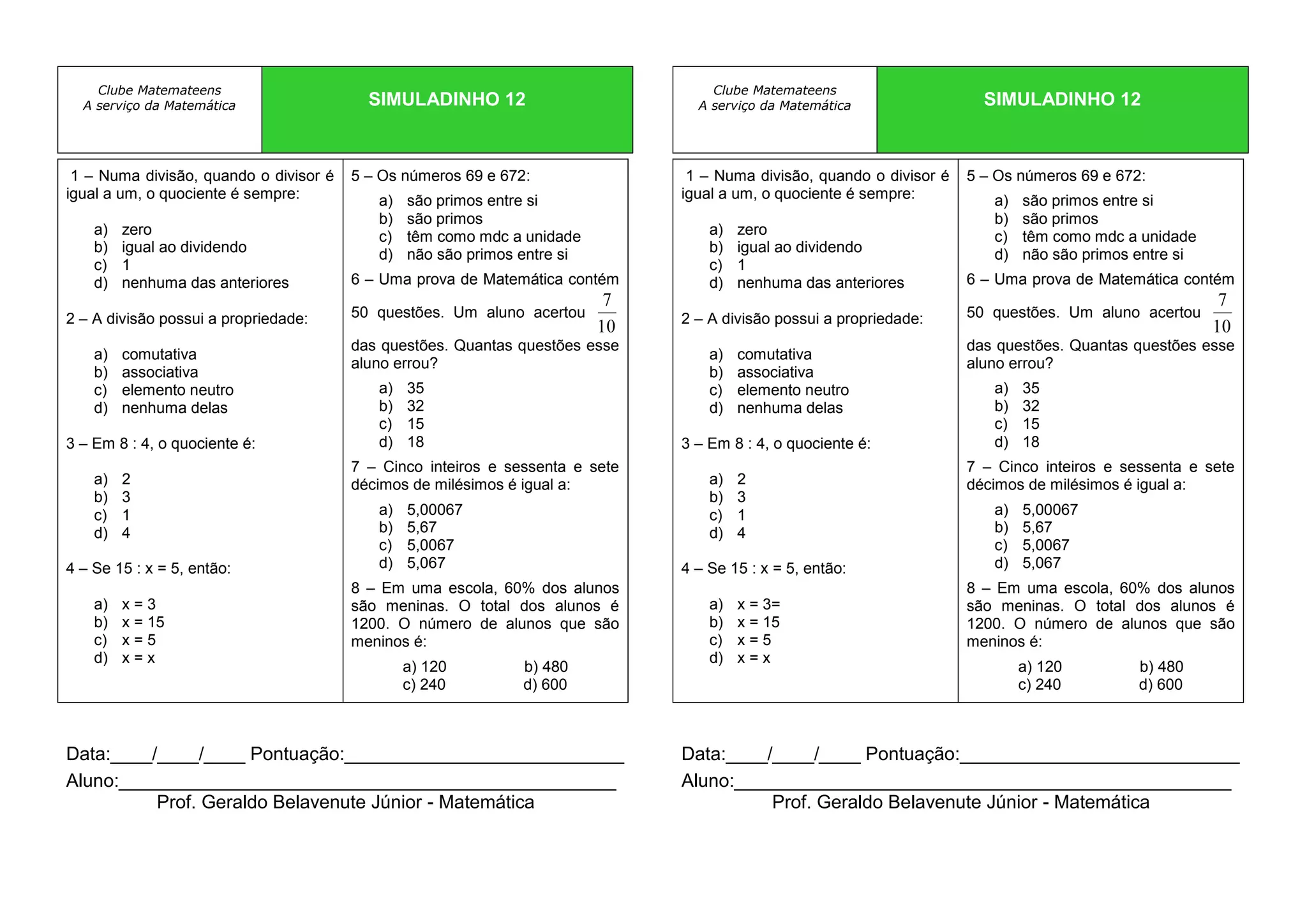 O documento apresenta 8 questões de matemática sobre divisão, números primos, porcentagem e outras operações matemáticas. As questões 1-4 tratam de propriedades da divisão, como quociente e resto. As questões 5-7 envolvem números primos e operações com inteiros e decimais. A questão 8 calcula o número de alunos do sexo masculino baseado no total de alunos e na porcentagem de alunas.