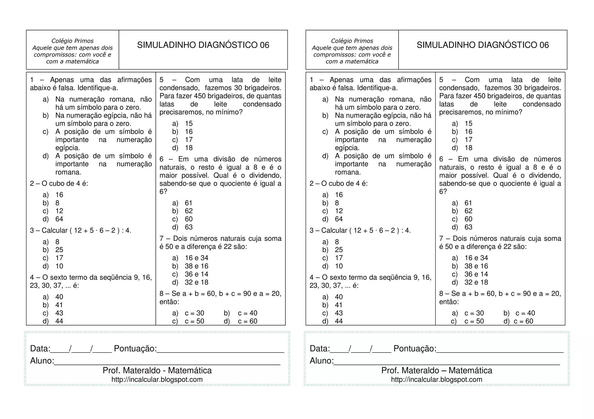 O documento contém 8 questões de matemática sobre números naturais, operações matemáticas e sequências numéricas. As questões 1 a 8 abordam tópicos como numeração romana e egípcia, cubos, divisão, soma e diferença de números naturais e termos de uma sequência numérica.