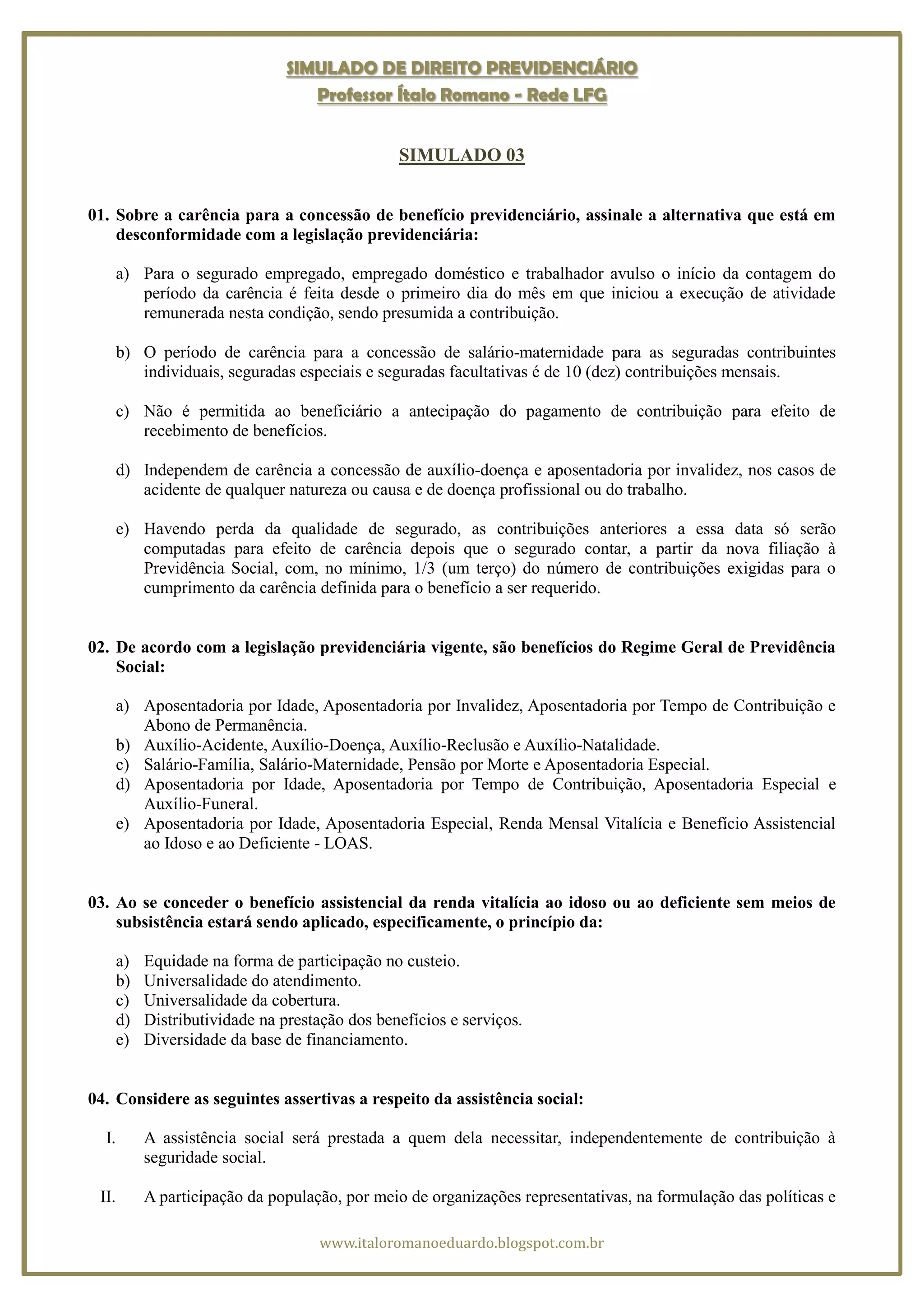 O documento apresenta um simulado de 13 questões sobre direito previdenciário com alternativas de resposta. As questões abordam temas como carência para benefícios, benefícios do Regime Geral de Previdência Social, princípios da seguridade social e classificação de segurados. O documento também fornece o gabarito com as respostas corretas para cada questão.