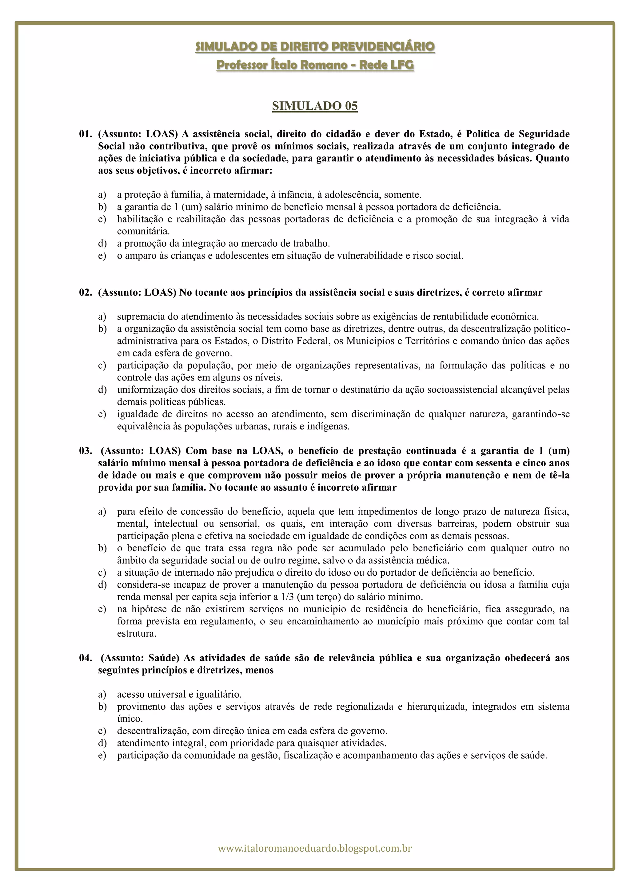 Este documento apresenta 12 questões sobre direito previdenciário com seus respectivos gabaritos. As questões abordam temas como LOAS, BPC, dependentes e carência. O documento fornece casos práticos e alternativas de respostas para que o leitor teste seus conhecimentos sobre a legislação previdenciária brasileira.