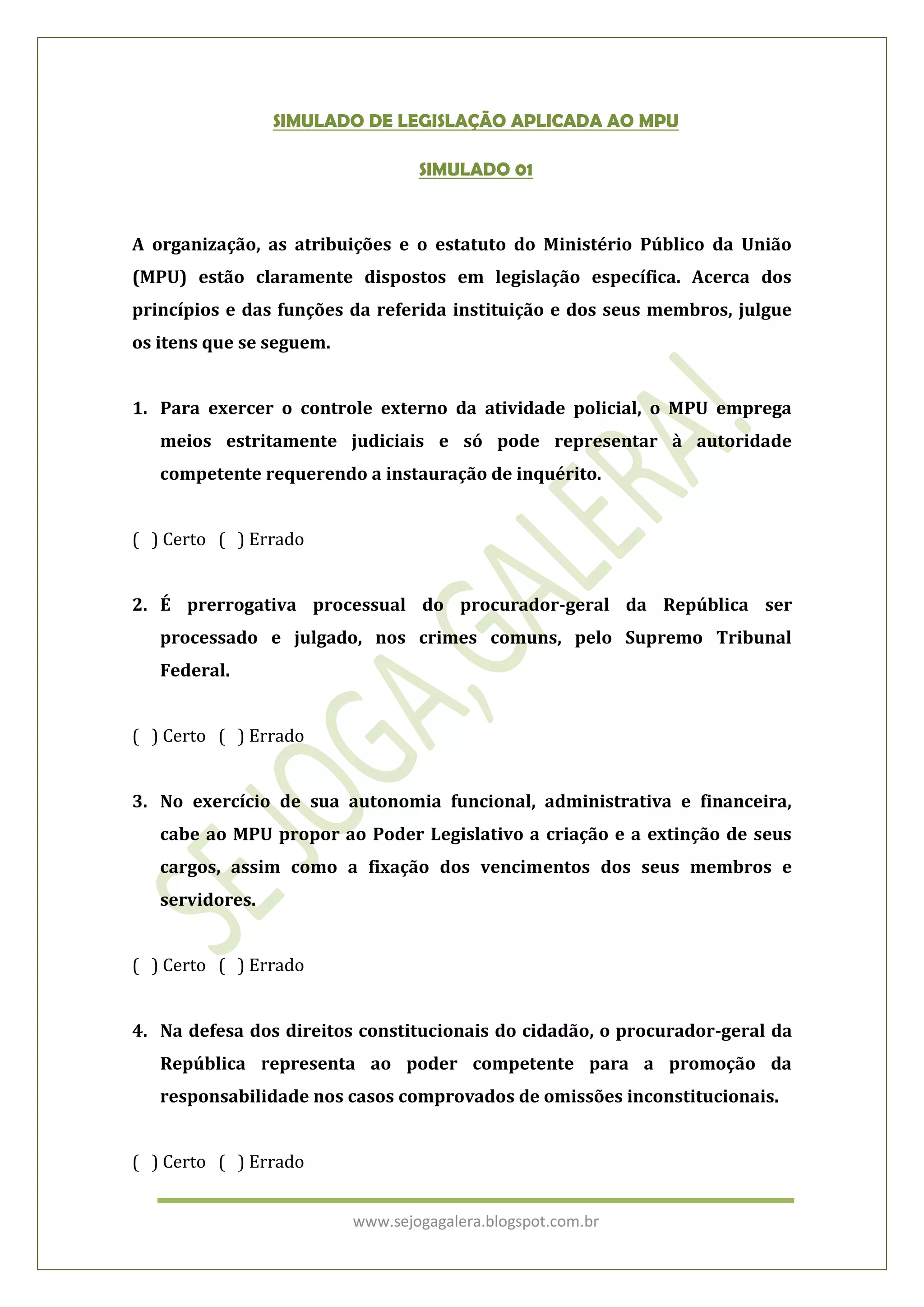 O documento discute as atribuições, princípios e estrutura do Ministério Público da União (MPU) de acordo com a legislação brasileira. Ele contém 10 questões sobre a organização do MPU, competências de seus membros, Lei Orgânica Nacional do Ministério Público e outros tópicos relacionados. O gabarito no final indica as respostas corretas para cada questão.