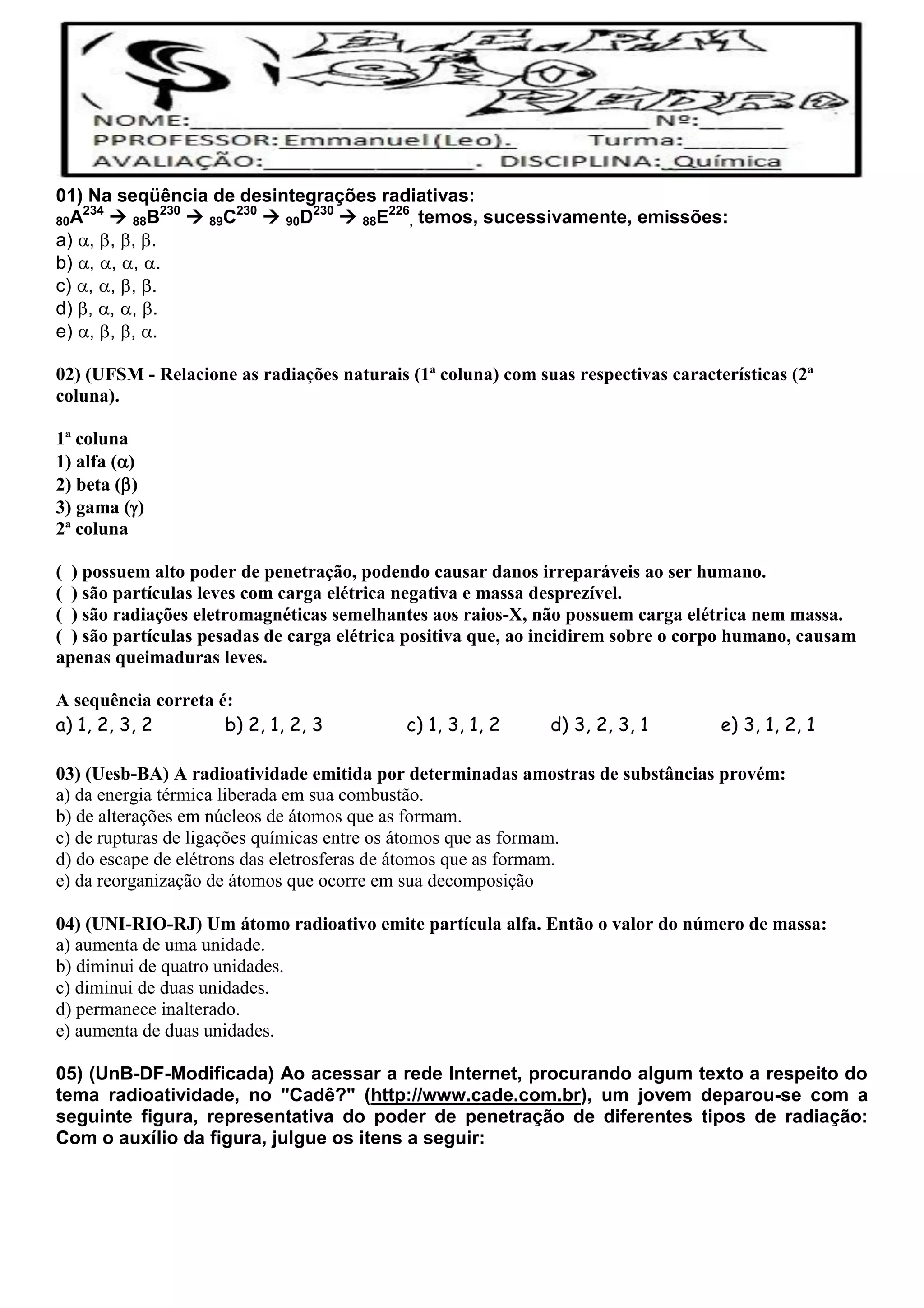 O documento discute vários aspectos da radioatividade, incluindo: 1) Uma sequência de desintegrações radiativas envolvendo emissões alfa e beta; 2) A associação entre diferentes tipos de radiação (alfa, beta, gama) e suas características; 3) Que a radioatividade emitida por substâncias provém da alteração de núcleos atômicos; 4) Que a emissão de partículas alfa altera o número de massa do átomo.