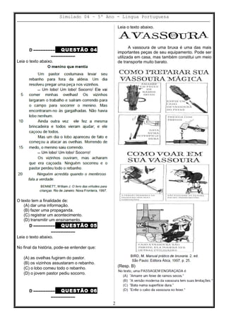Este documento contém um simulado de 10 questões sobre língua portuguesa para alunos do 5o ano. As questões abordam tópicos como leitura de textos, identificação de informações, finalidade de textos e resolução de problemas.
