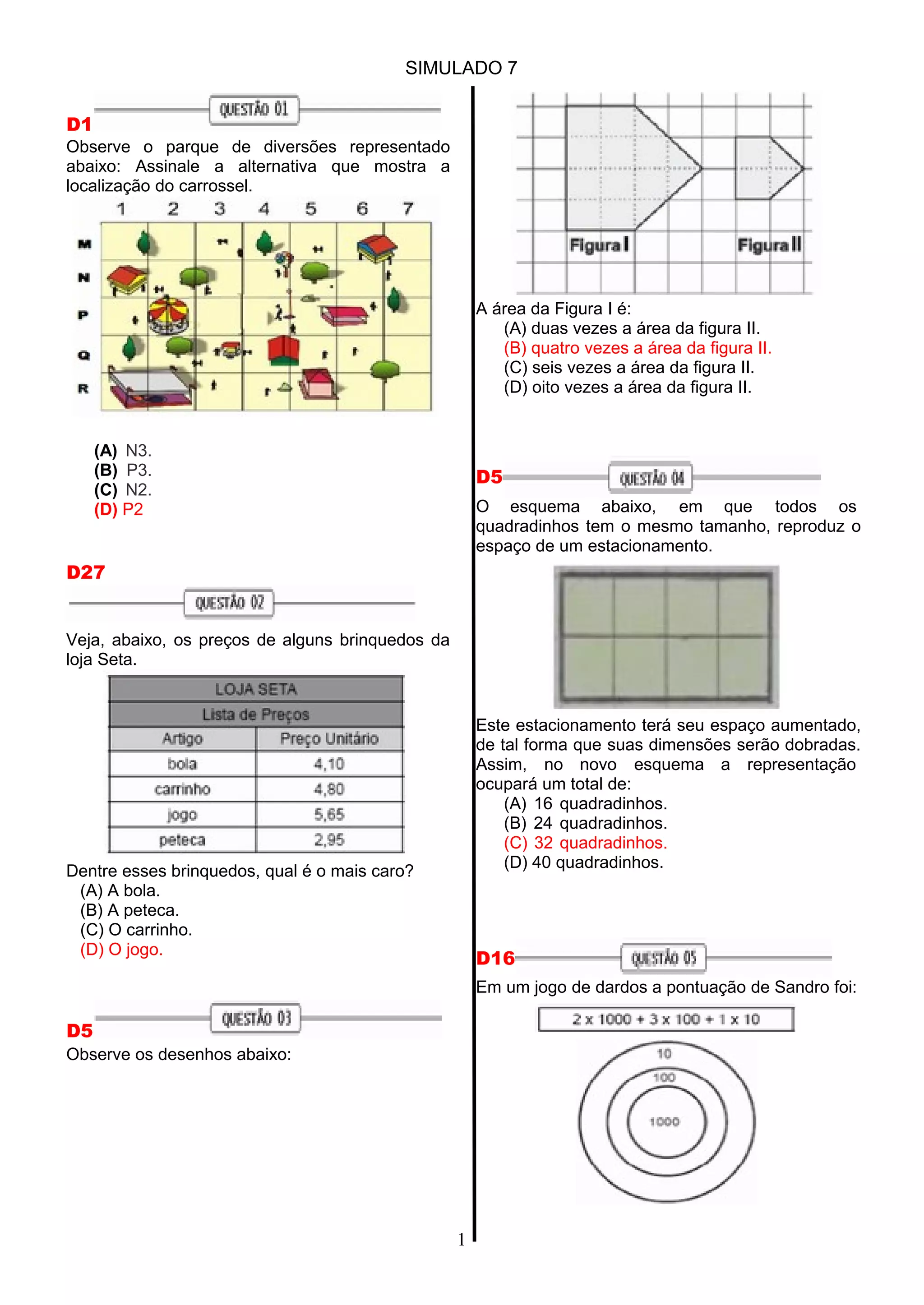 Este documento contém 14 questões de múltipla escolha sobre vários assuntos como geometria, matemática e interpretação de imagens. As questões envolvem identificar localizações em um parque de diversões, comparar preços de brinquedos, calcular áreas de figuras geométricas, multiplicação, identificar números em uma reta numérica e contar moedas e notas de dinheiro.
