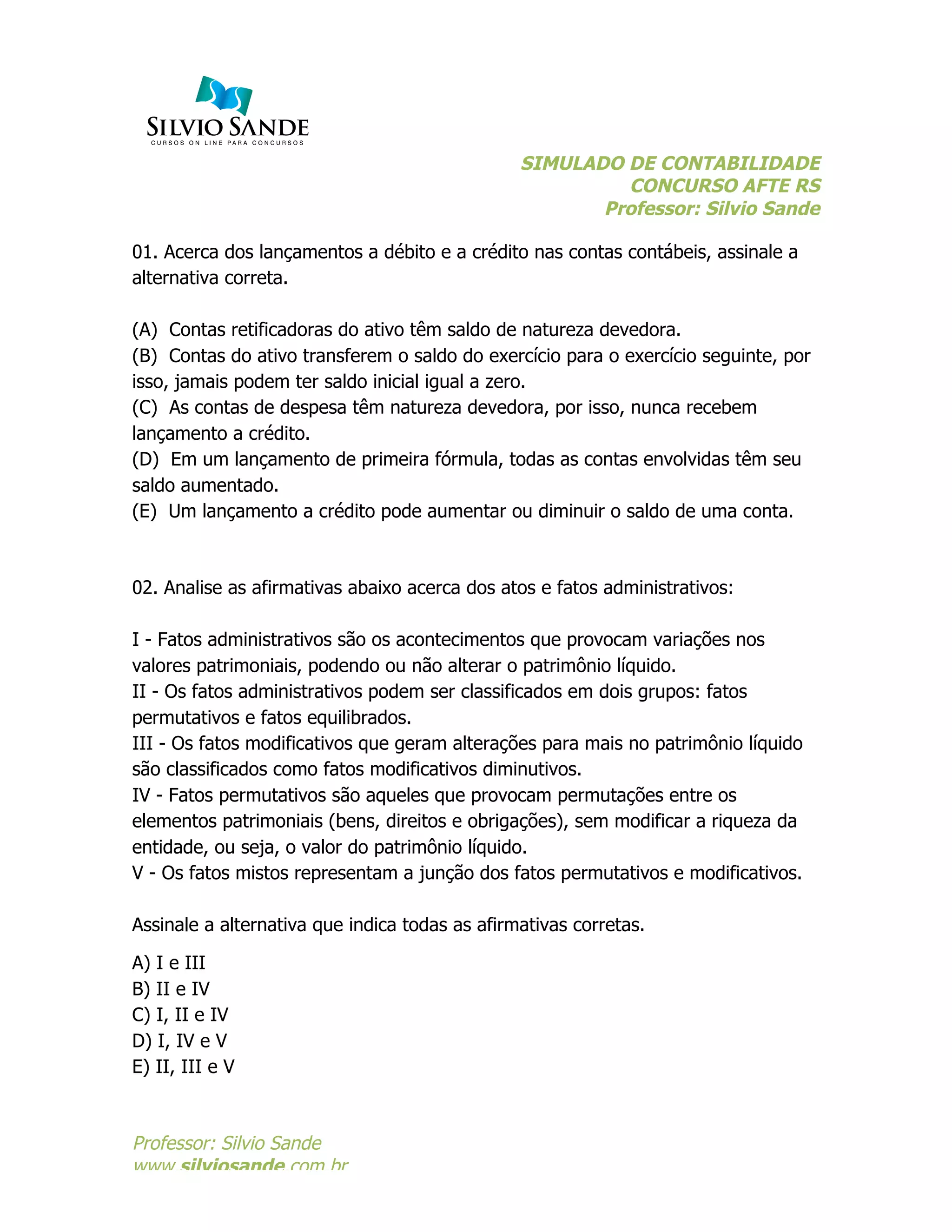 O documento apresenta um simulado de contabilidade com 14 questões sobre diversos temas como lançamentos contábeis, ativos, fatos contábeis, demonstrações financeiras e depreciação. As questões abordam conceitos importantes da contabilidade como natureza das contas, métodos de depreciação, critérios de reconhecimento de ativos e apuração de resultados.