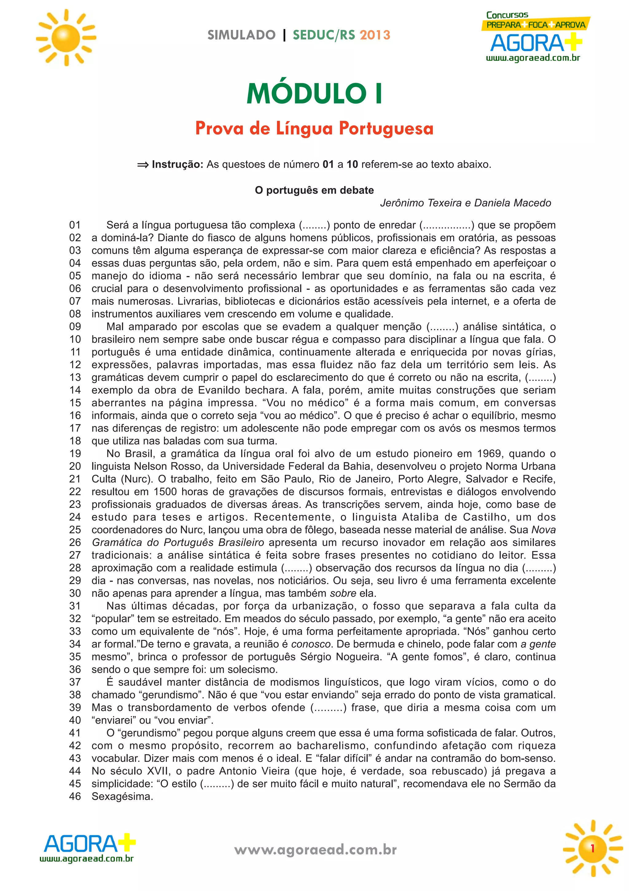 Este documento apresenta um simulado de prova de língua portuguesa aplicado pela Secretaria de Educação do Rio Grande do Sul em 2013. A prova contém questões sobre um texto que discute aspectos da língua portuguesa falada e escrita no Brasil, como variações regionais, formalidade de registro e a importância da leitura para o domínio da língua.