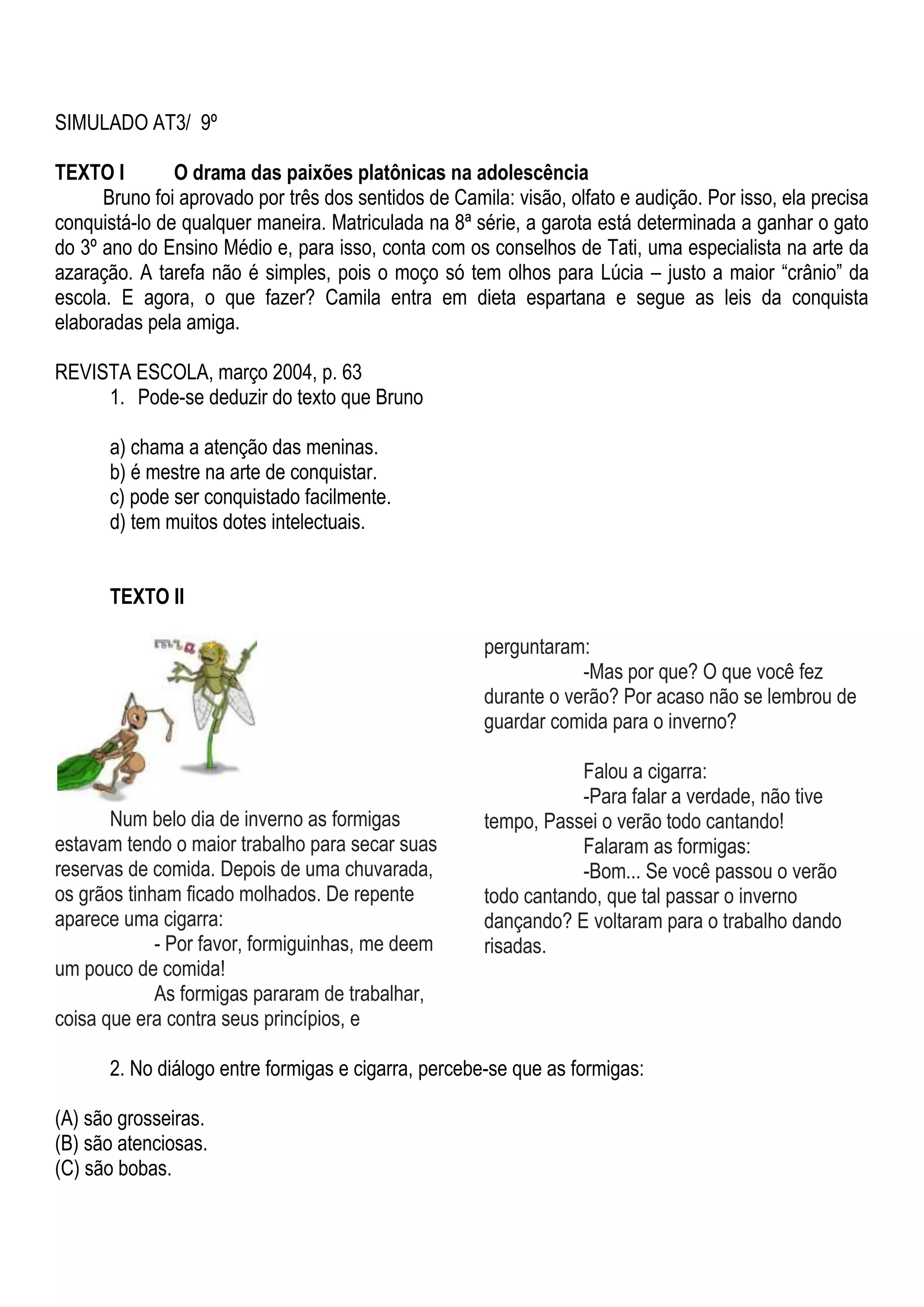 2) Uma das questões trata de um diálogo entre formigas e cigarra sobre o trabalho das formigas durante o verão e o pedido de comida da cigarra durante o inverno;
