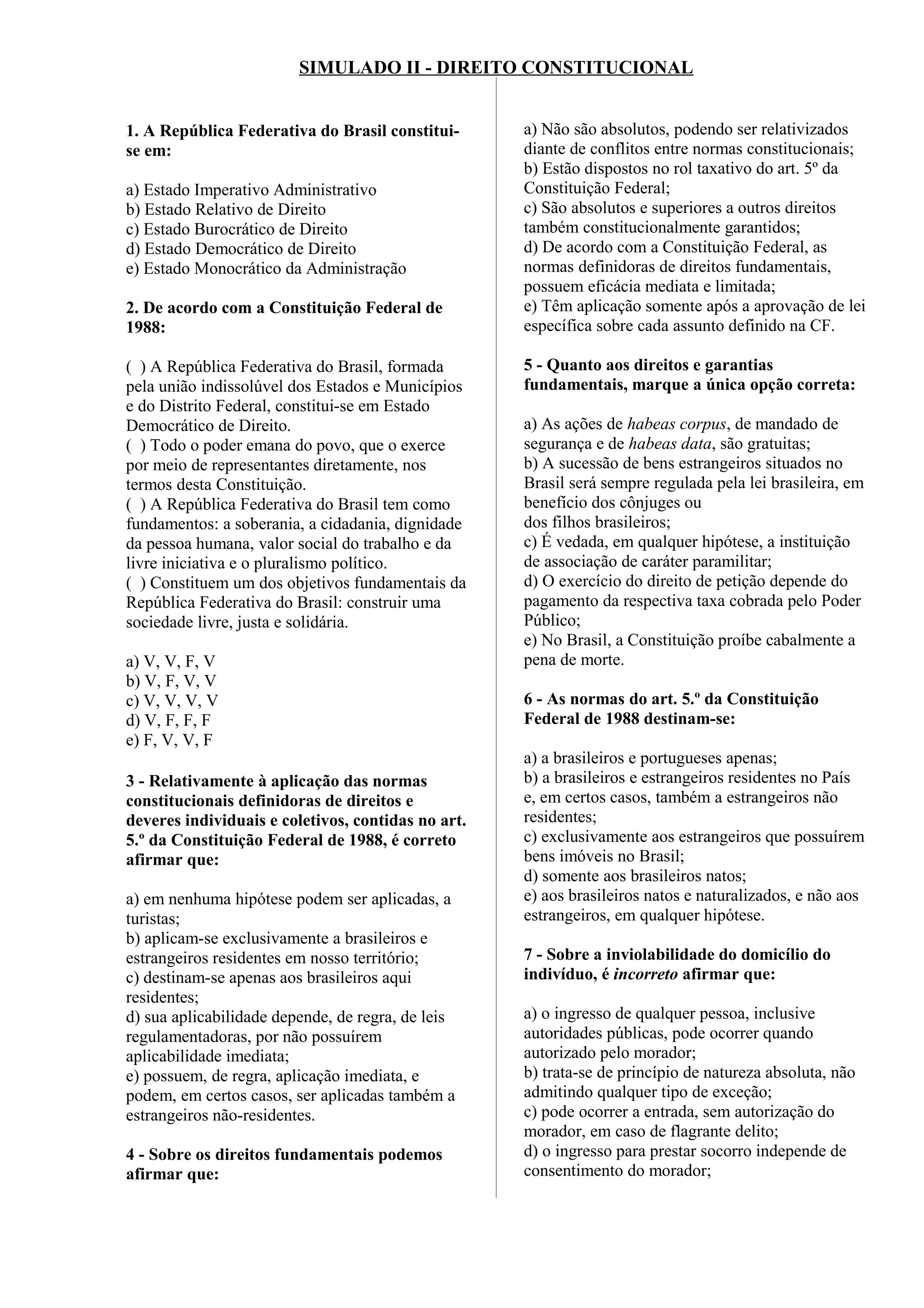 O documento apresenta 23 questões sobre direitos e garantias constitucionais no Brasil. As questões abordam tópicos como a natureza do Estado brasileiro, os fundamentos do Estado Democrático de Direito, direitos e deveres individuais e coletivos, direitos sociais, direitos e garantias fundamentais e aplicabilidade das normas constitucionais.