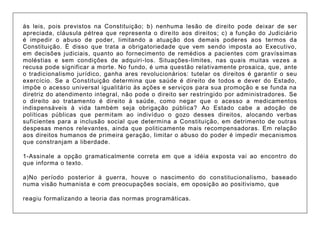 A passagem discute o papel do Judiciário em garantir os direitos fundamentais estabelecidos na Constituição, mesmo quando isso significa limitar os outros poderes. O texto argumenta que (1) princípios constitucionais são superiores às leis ordinárias e (2) o Judiciário deve impedir abusos de poder e assegurar que ninguém tenha seus direitos negados, inclusive o acesso a medicamentos essenciais.