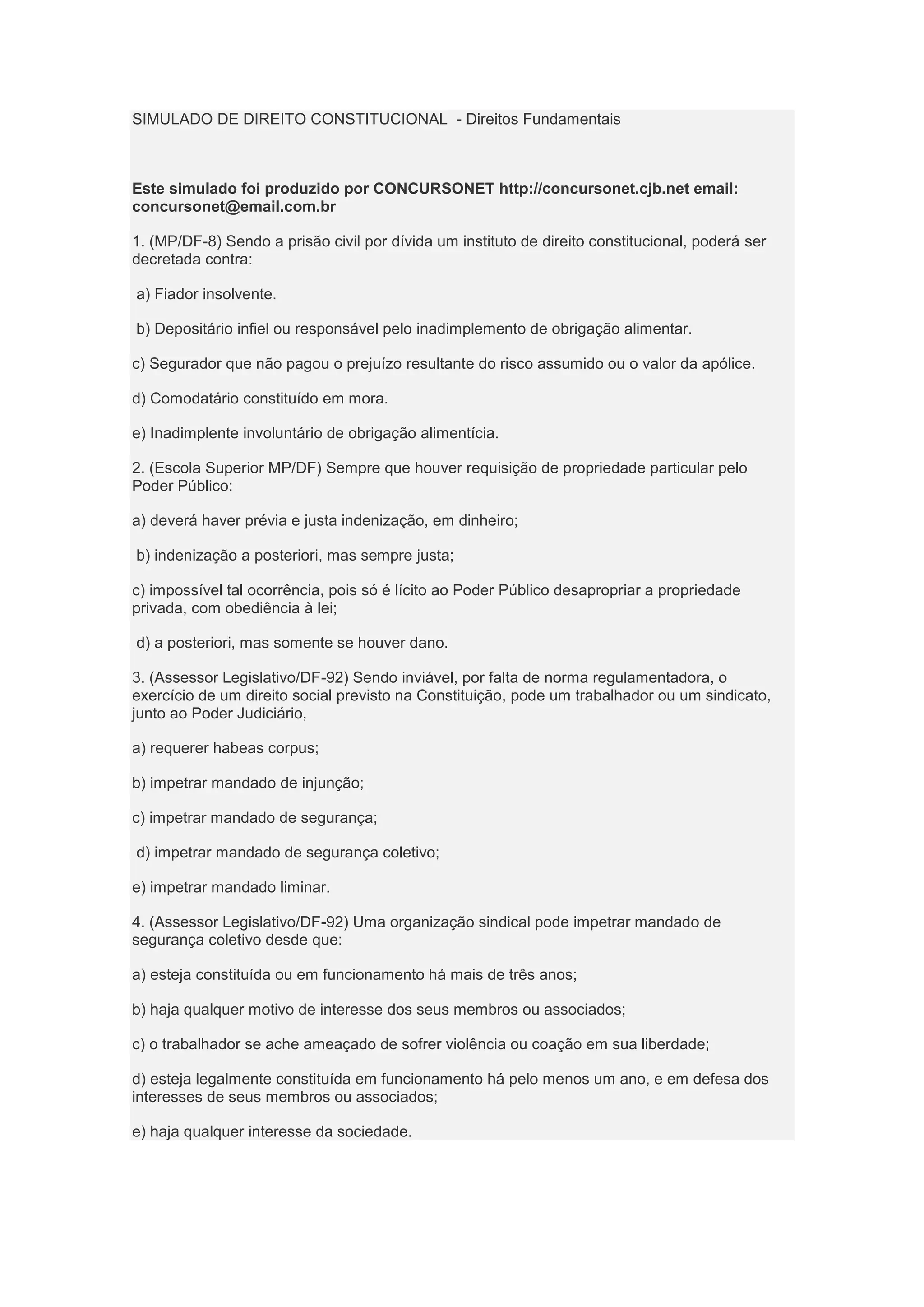 Este simulado de direito constitucional contém questões sobre direitos fundamentais como prisão por dívida, desapropriação, mandado de segurança coletivo e habeas data.