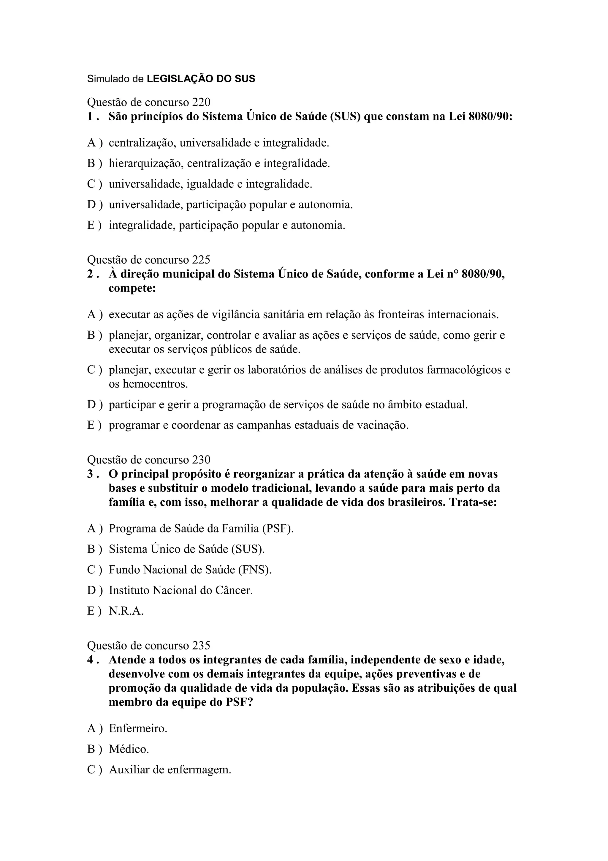 O documento apresenta 10 questões sobre legislação do Sistema Único de Saúde brasileiro. As questões abordam princípios e atribuições do SUS definidos na Lei 8080/90, como universalidade, integralidade e participação popular. Também discutem a organização dos serviços de saúde nos diferentes níveis de governo e a composição mínima da equipe do Programa Saúde da Família.