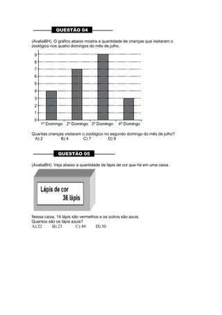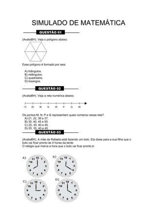 Este documento contém 20 questões de um simulado de matemática abrangendo tópicos como geometria plana, números, operações matemáticas e interpretação de dados. As questões variam entre escolha múltipla, correspondência, cálculo e interpretação de gráficos e tabelas.