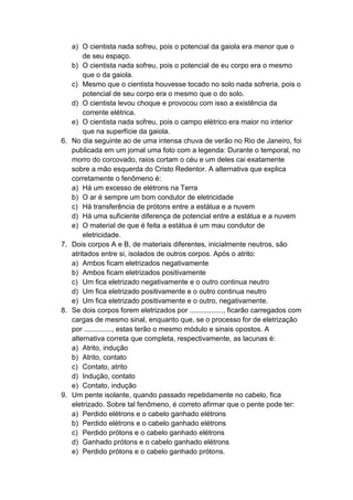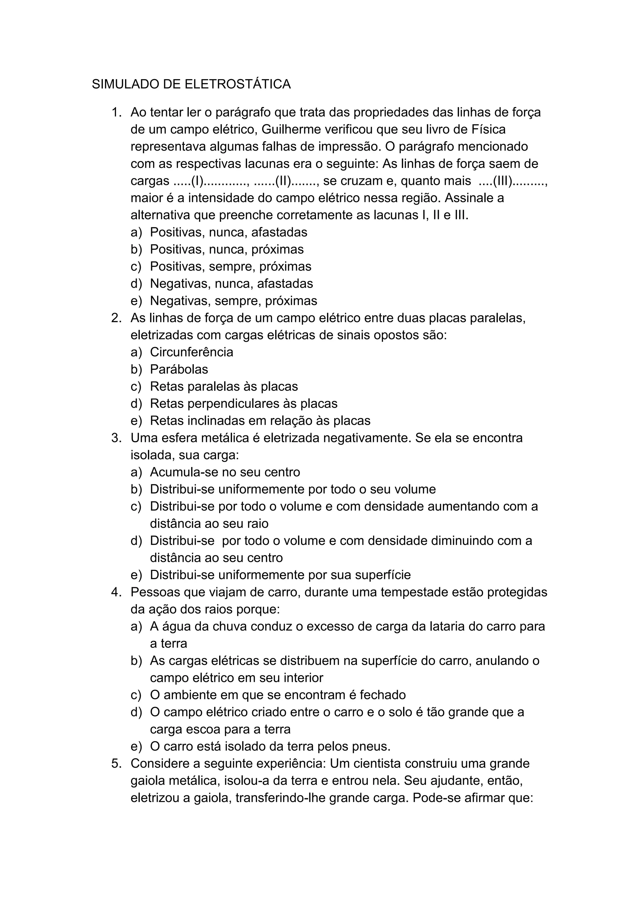 O documento apresenta 10 questões sobre eletrostática. As questões abordam tópicos como linhas de força elétrica, distribuição de carga em esferas eletrizadas, proteção contra raios em carros e indução eletrostática.