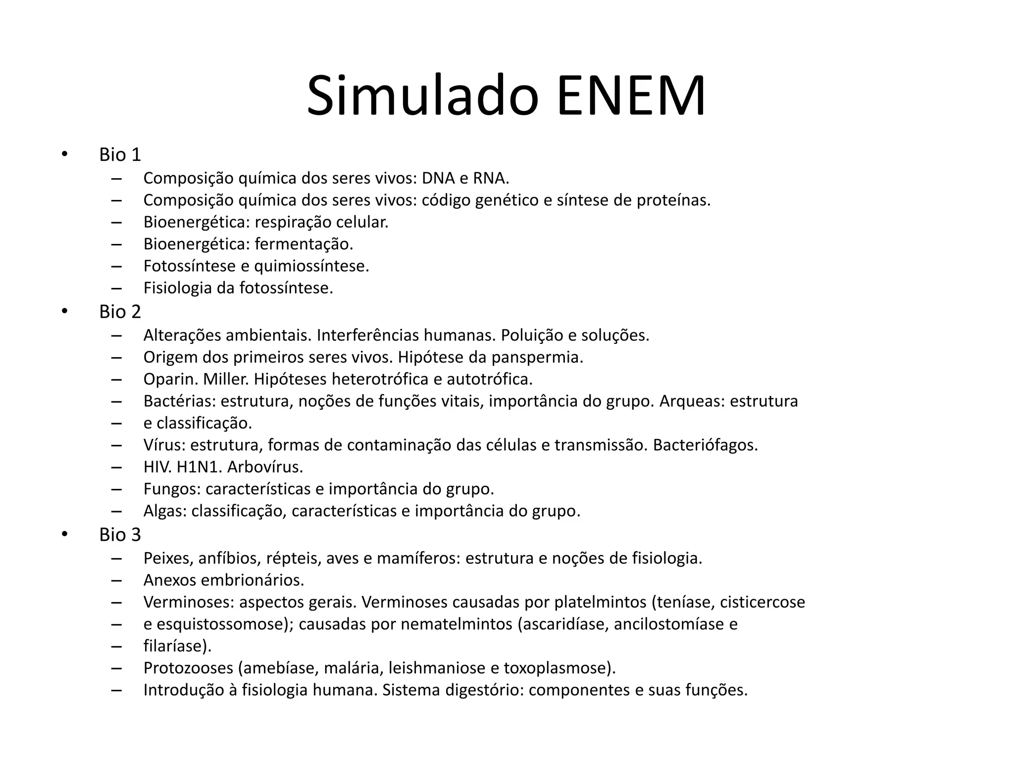 O documento apresenta um simulado do ENEM dividido em três partes de biologia. A primeira parte aborda tópicos como composição química dos seres vivos, código genético, bioenergética e fotossíntese. A segunda parte discute alterações ambientais, origem da vida, classificação de bactérias, vírus, fungos e algas. A terceira parte fala sobre estrutura e fisiologia de vertebrados, anexos embrionários, verminoses e protozooses.