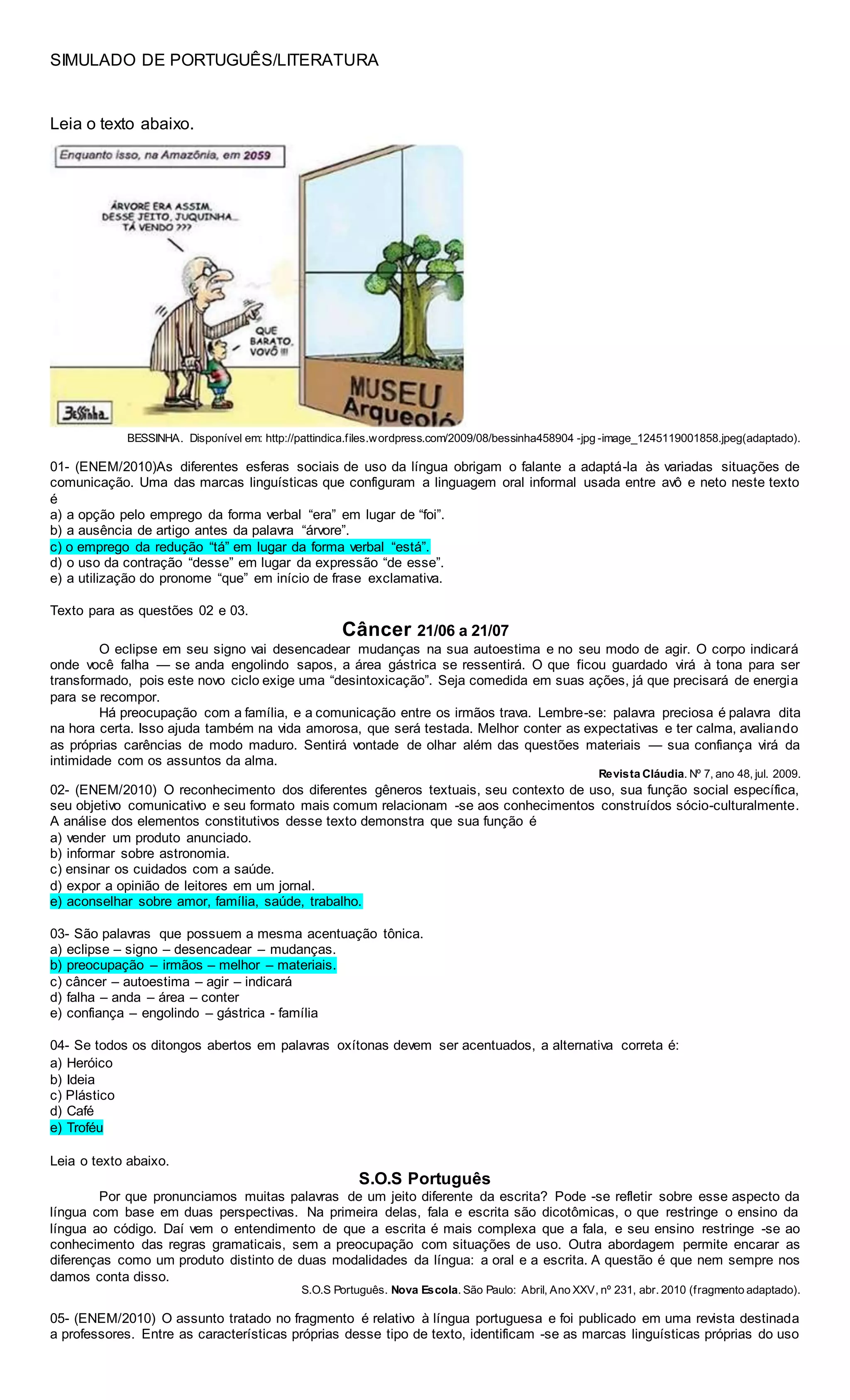 O documento apresenta questões sobre um texto literário e seu resumo em 3 frases ou menos. Discute o uso da linguagem informal entre avô e neto no texto e identifica qual marca linguística configura essa informalidade. A seguir, apresenta um texto sobre previsões astrológicas para o signo de Câncer e questões relacionadas ao gênero textual. Por fim, discute a acentuação tônica de palavras no texto.