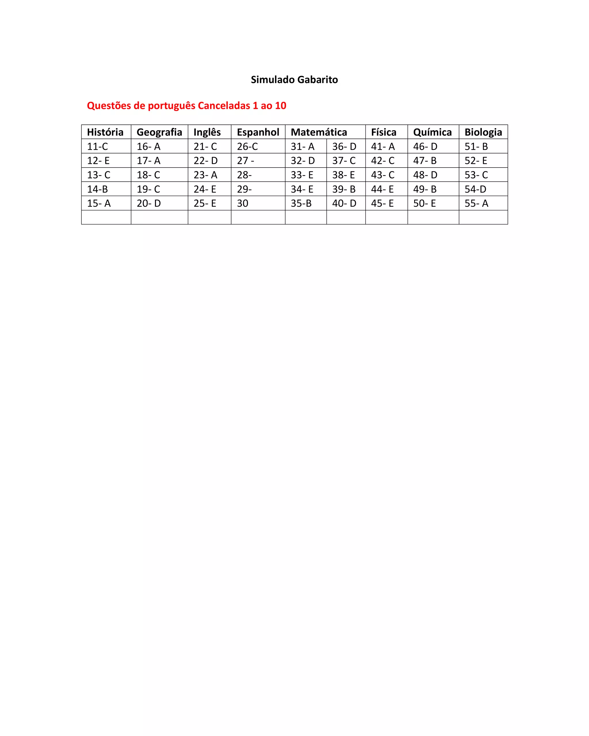 O documento apresenta as respostas corretas para um simulado com questões de diversas disciplinas como português, história, geografia, inglês, espanhol, matemática, física, química, biologia. As questões estão numeradas de 11 a 55 e as alternativas corretas vão de A a E.