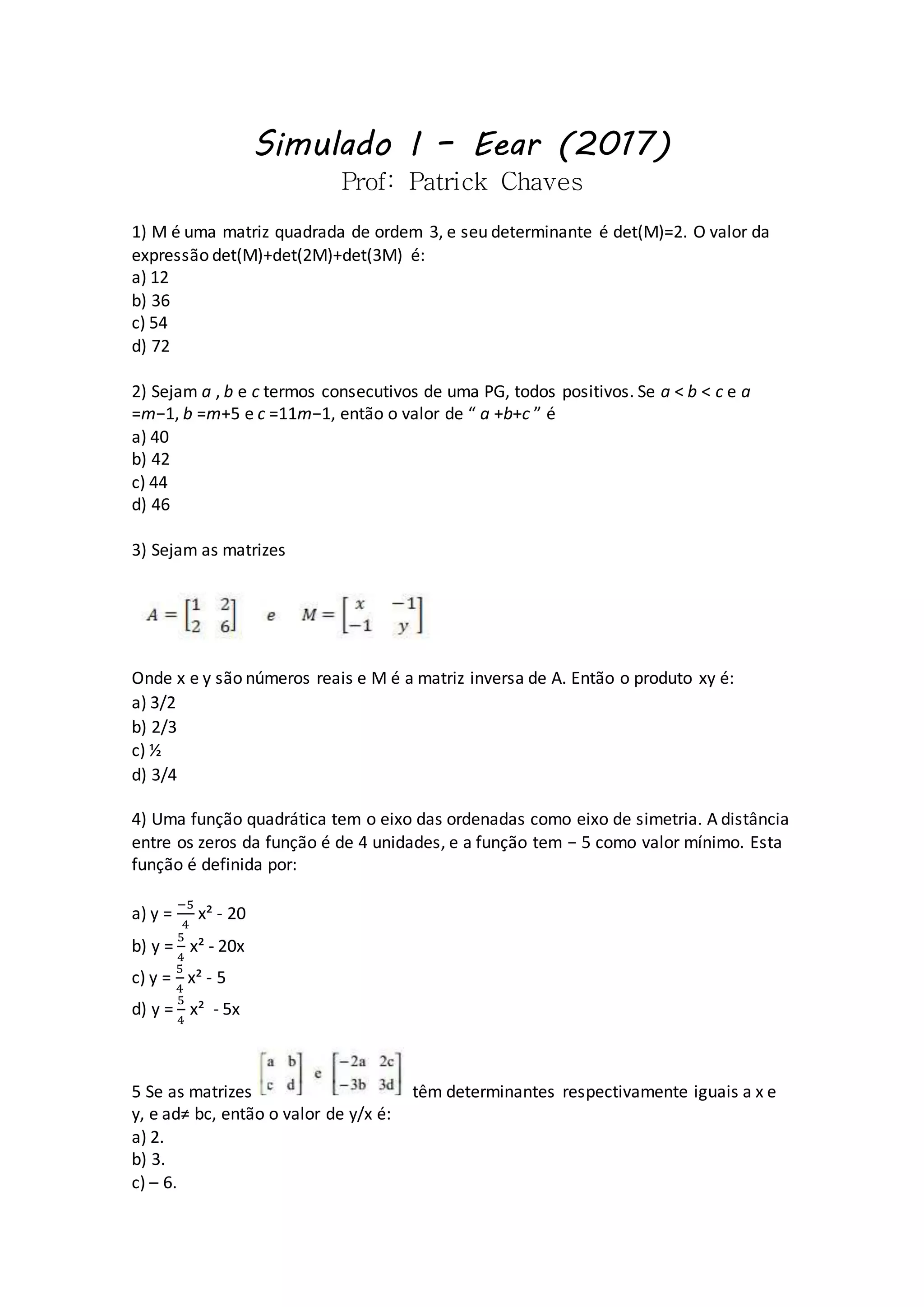 Este documento contém 24 questões de múltipla escolha sobre diversos assuntos como matrizes, funções, geometria e lógica. A maioria das questões trata de determinantes de matrizes, propriedades de funções quadráticas, relações trigonométricas em triângulos e áreas de figuras planas. O gabarito no final fornece as respostas corretas para cada uma das questões.