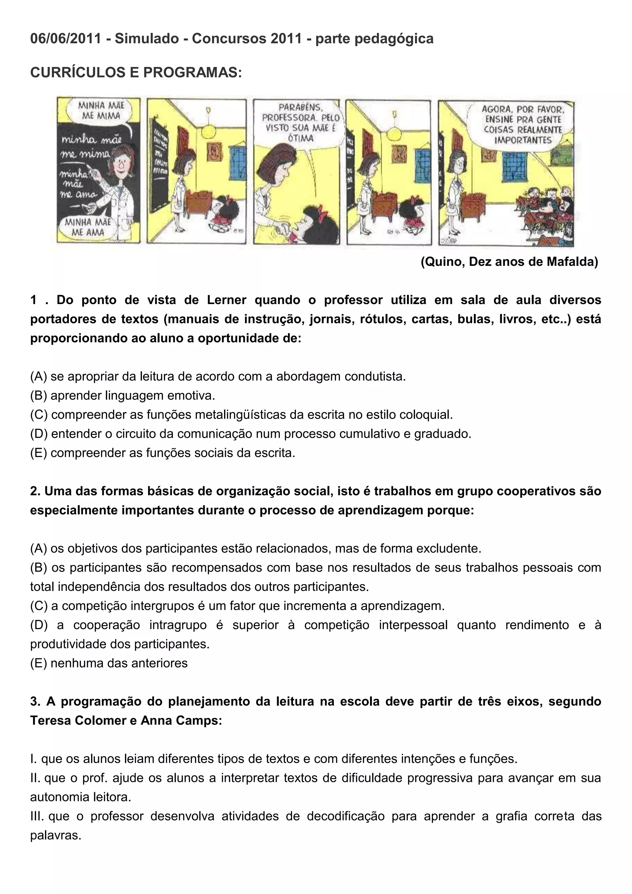 Este documento apresenta 19 questões sobre educação, incluindo sobre currículos, programas de educação de jovens e adultos, educação inclusiva e o uso de tecnologias de informação e comunicação na educação. As questões abordam tópicos como organização social, aprendizagem cooperativa, planejamento da leitura, produção de textos, educação bilíngue para surdos e mudos, expectativas de aprendizagem e letramento.