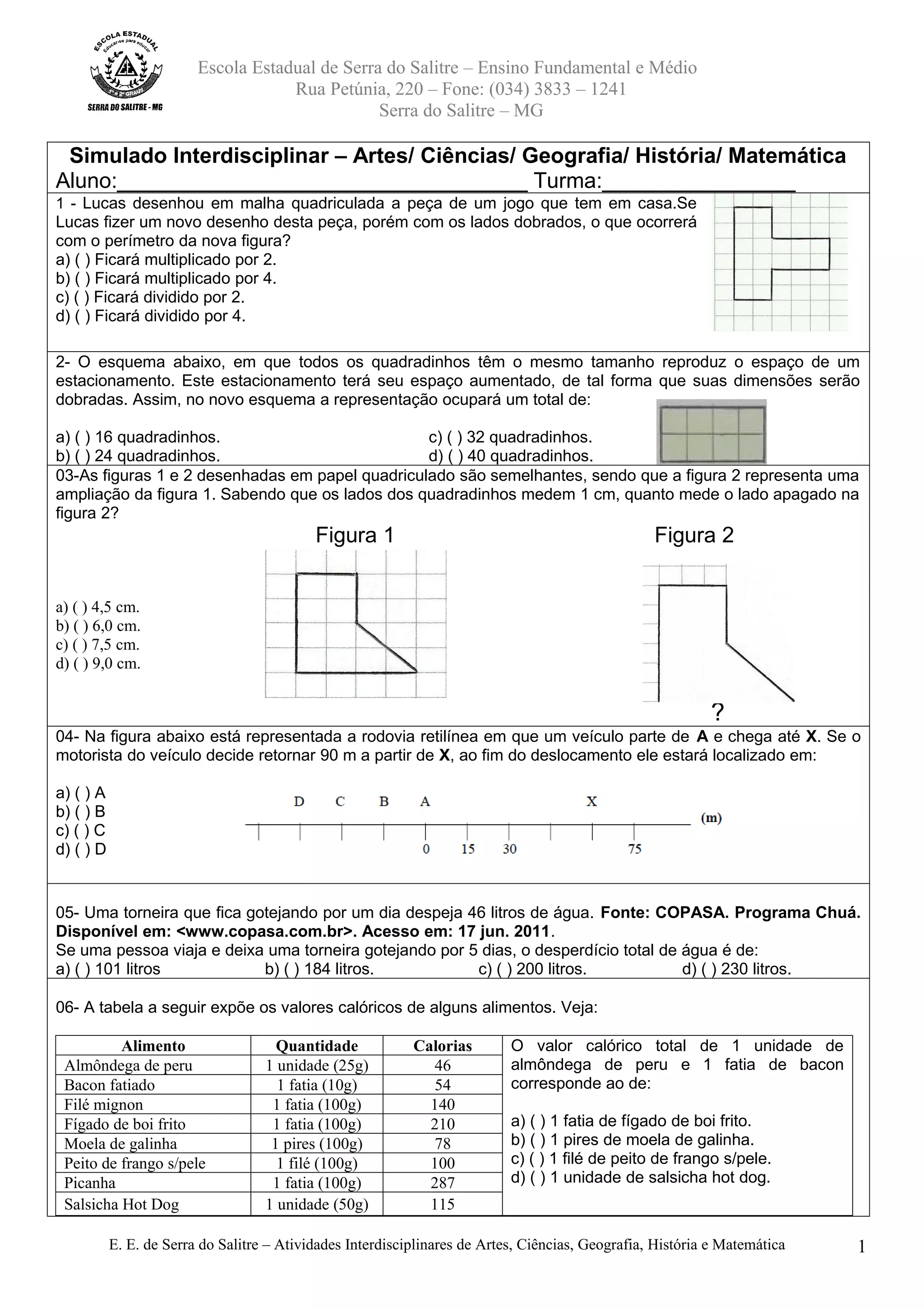 1) O documento apresenta um simulado interdisciplinar com 13 questões sobre diversos assuntos como matemática, ciências, geografia e história.