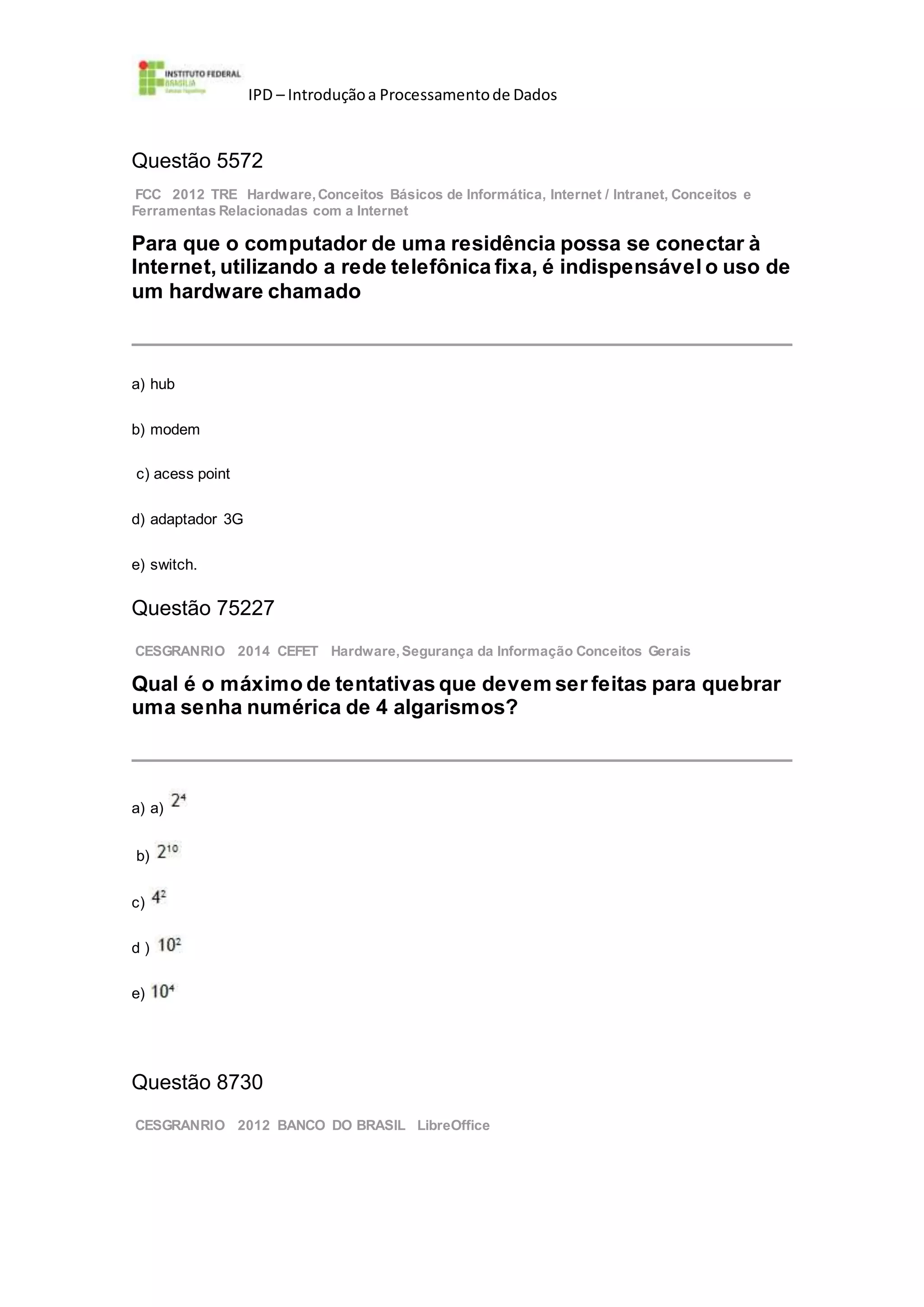 O documento contém questões sobre conceitos básicos de hardware e software, incluindo dispositivos de entrada e saída, sistemas operacionais, redes e acesso à internet. As questões abordam tópicos como modem, memória RAM, sistemas operacionais Linux e Windows, formatos de arquivos e conexões de hardware.